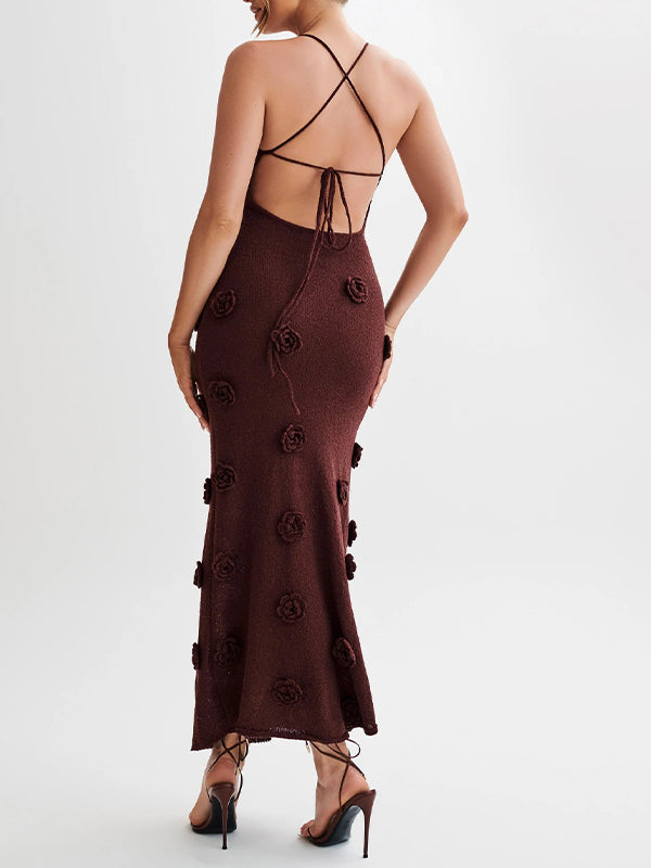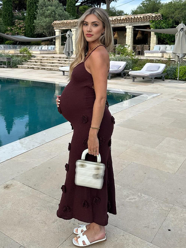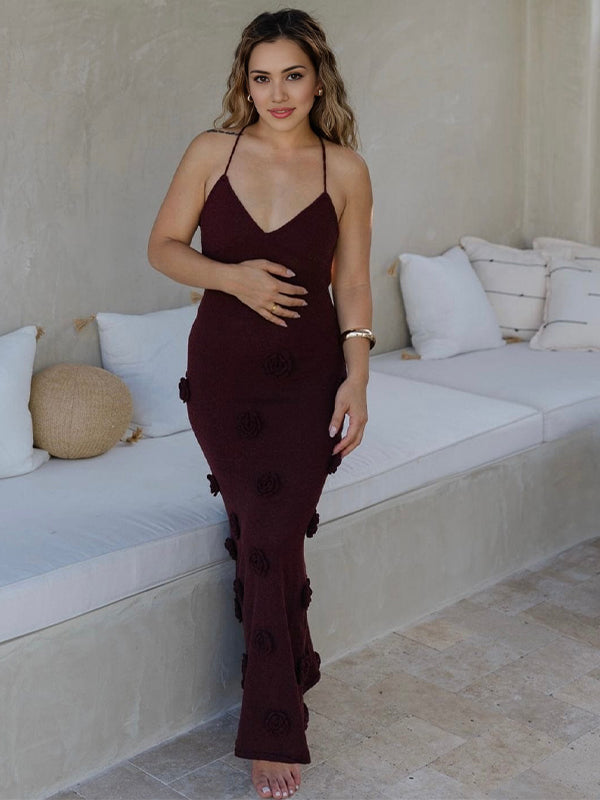 Momyknows Brown Halter Neck Backless 3D Flowers Crochet Mermaid Bodycon Elegant Photoshoot Baby Shower Maternity Maxi Dress