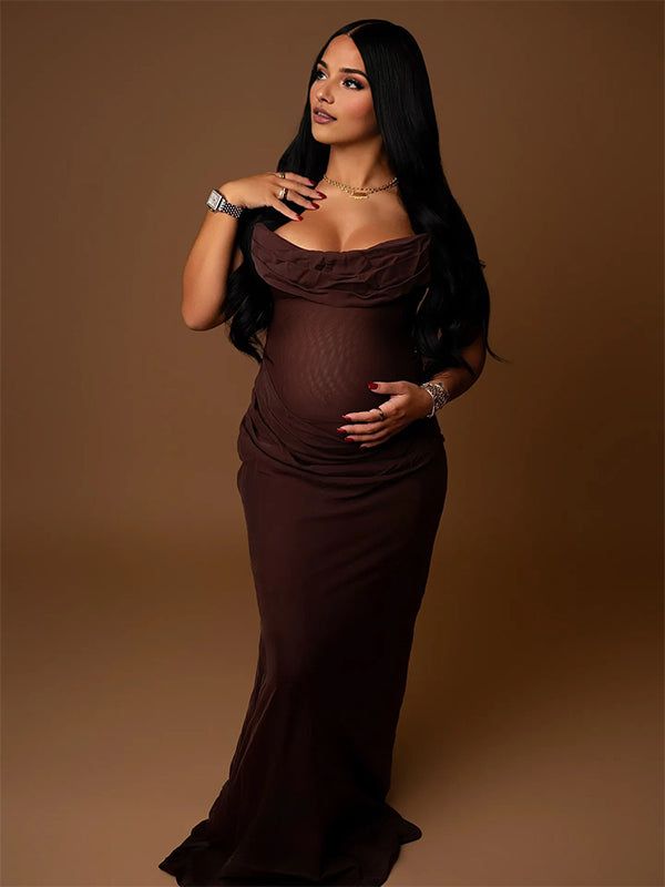 Momyknows Brown Mesh Ruched Bandeau Strapless Bodycon Maternity Maxi Dress