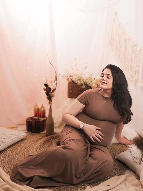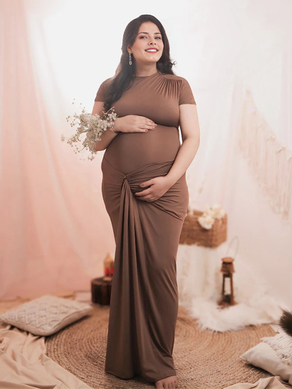 Momyknows Brown Ruched Draped Photoshoot Maternity Maxi Dress