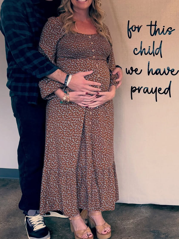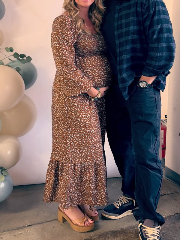 Momyknows Brown Smocked Print Button Maternity Baby Shower Maxi Dress