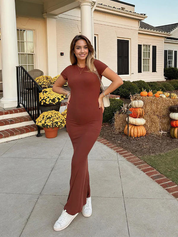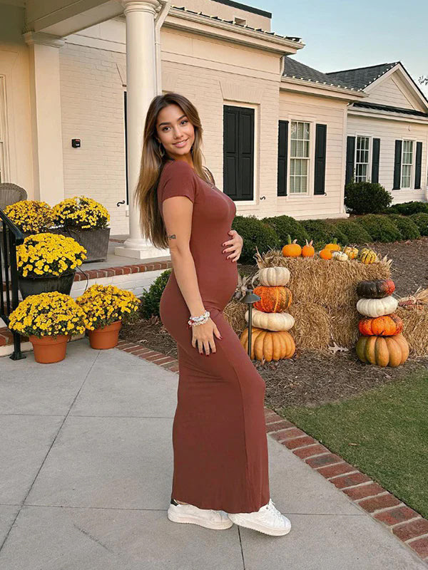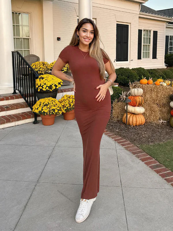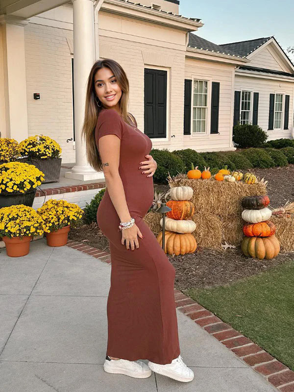 Momyknows Brown Solid Color Short Sleeve Bodycon Daily Casual Baby Shower Maternity Maxi Dress