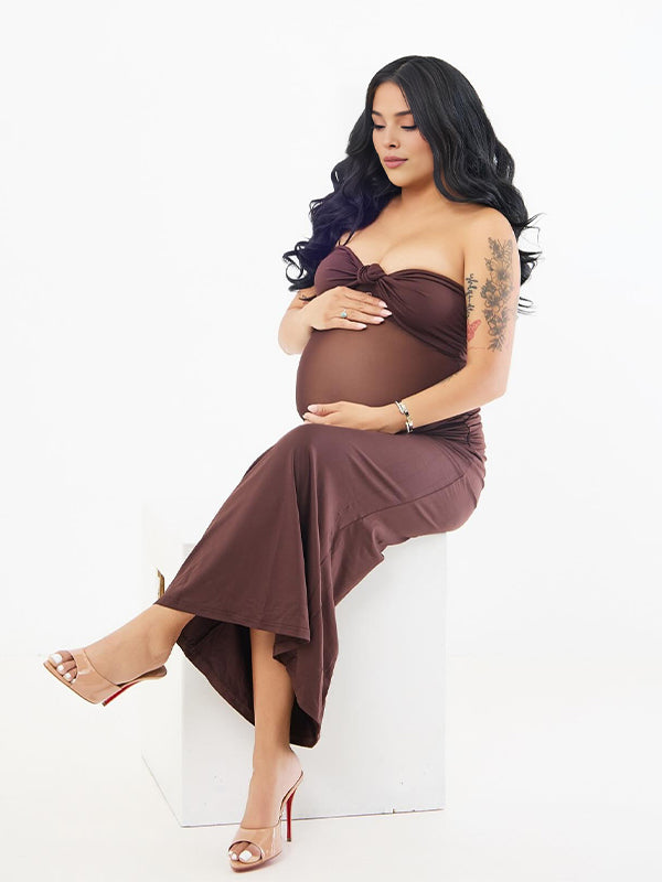 Momyknows Brown Twist Grenadine Sheer Ruched Photoshoot Maternity Maxi Dress