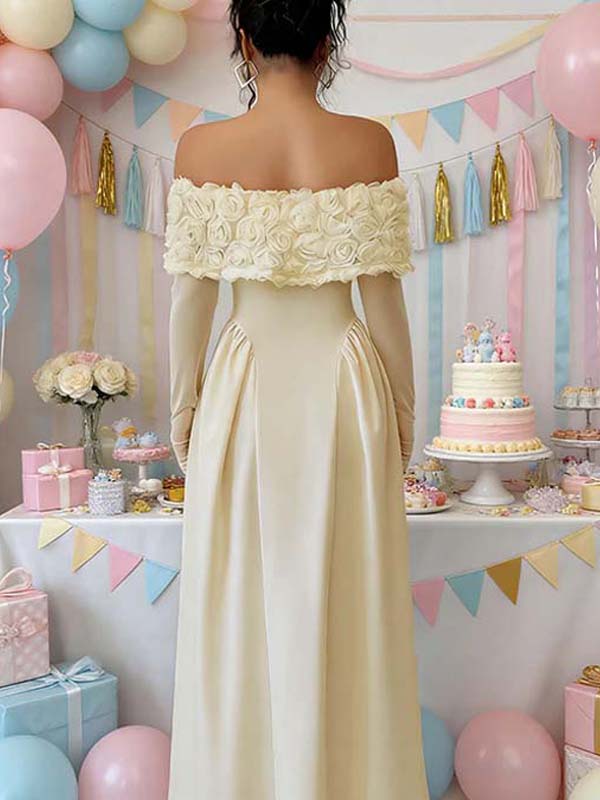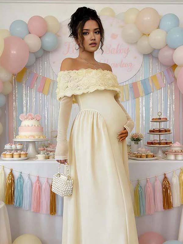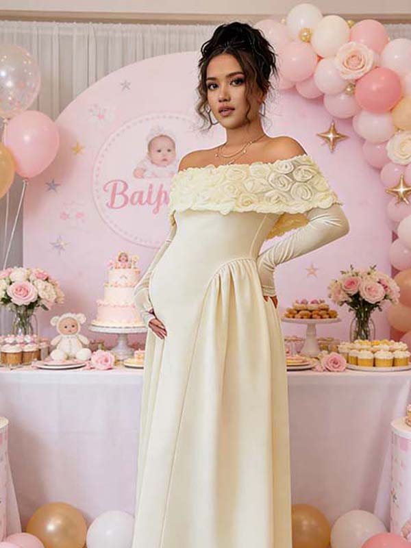 Momyknows Buff Off Shoulder 3D Flower Spliced Maternity Baby Shower Maxi Dress