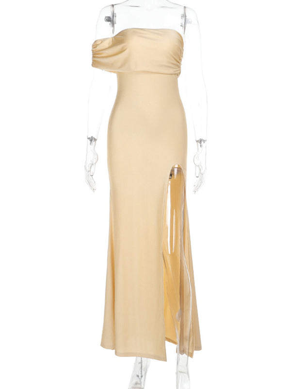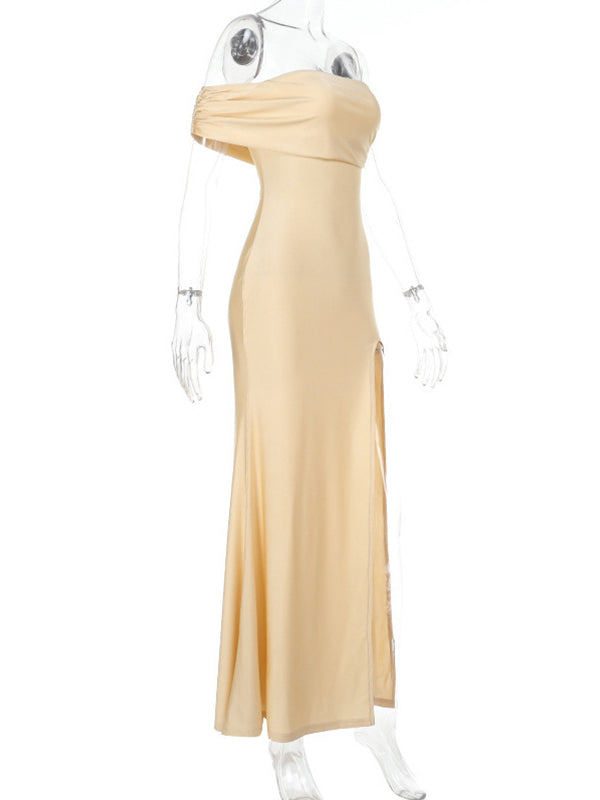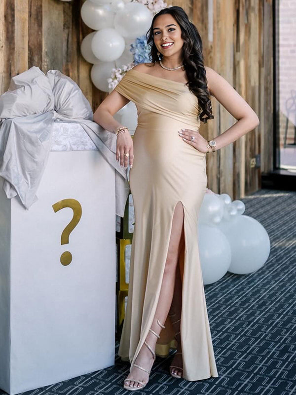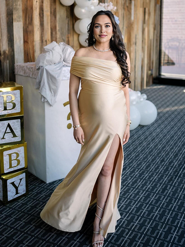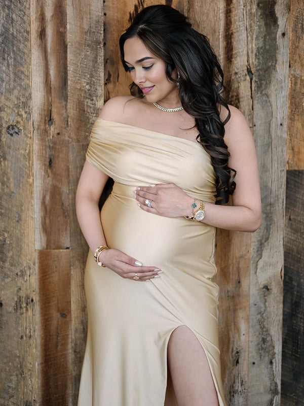 Momyknows Champagne Off Shoulder Ruched Side Slit Elegant Gown Maternity Maxi Dress