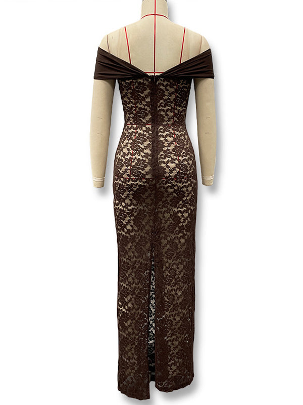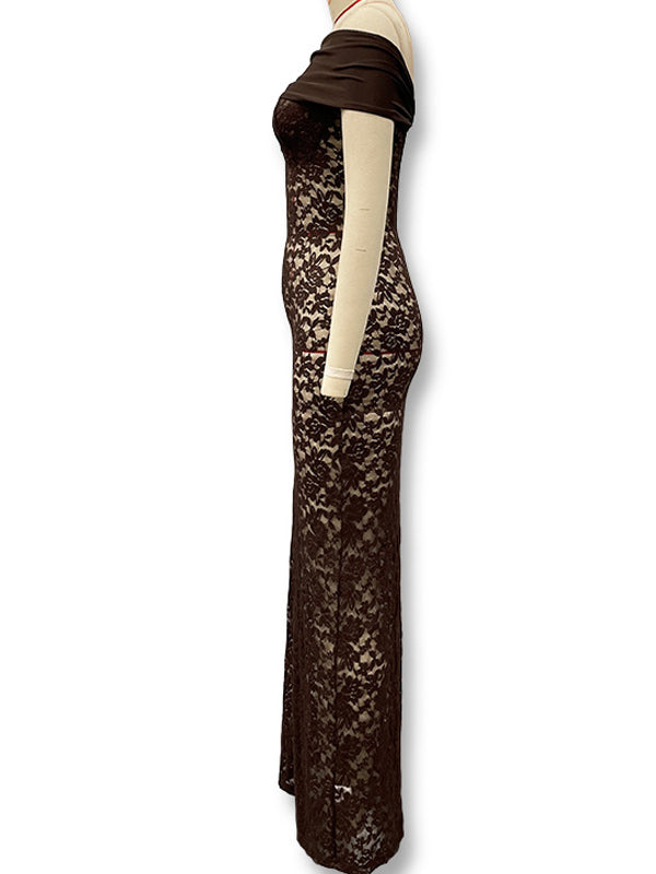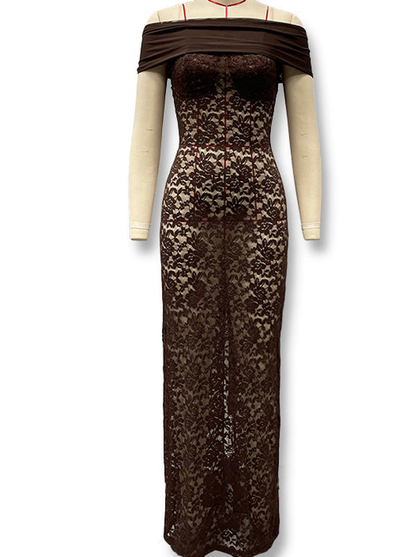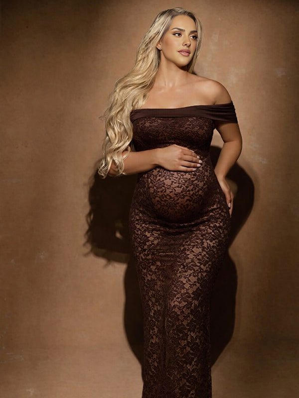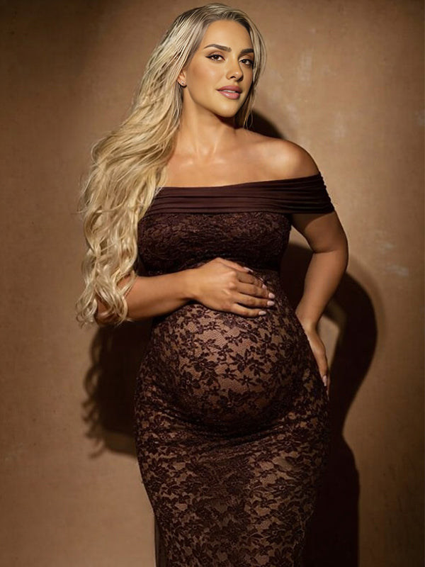 Momyknows Coffee Lace Mesh Off Shoulder Bodycon Sheer Maternity Maxi Dress