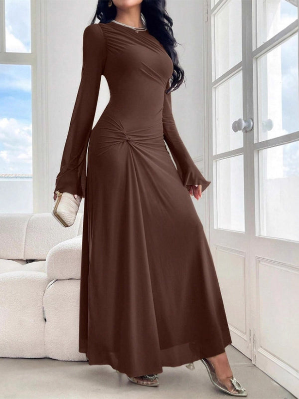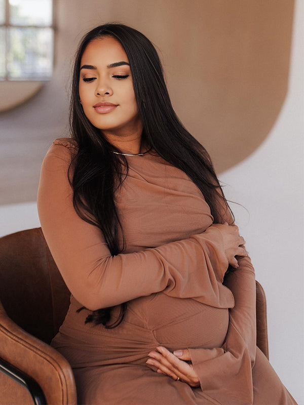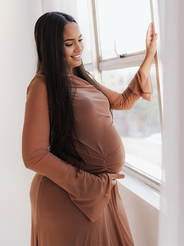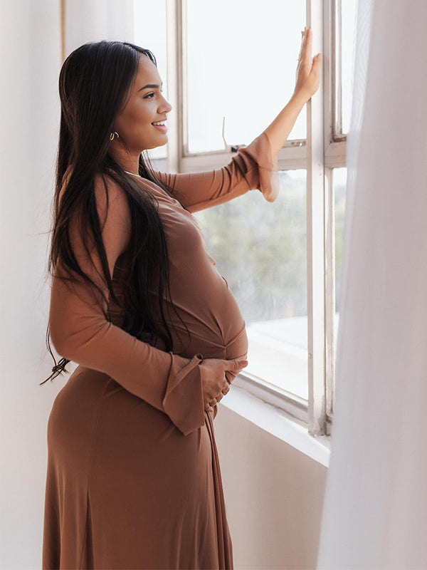 Momyknows Coffee Ruched Twist Photoshoot Maternity Maxi Dress