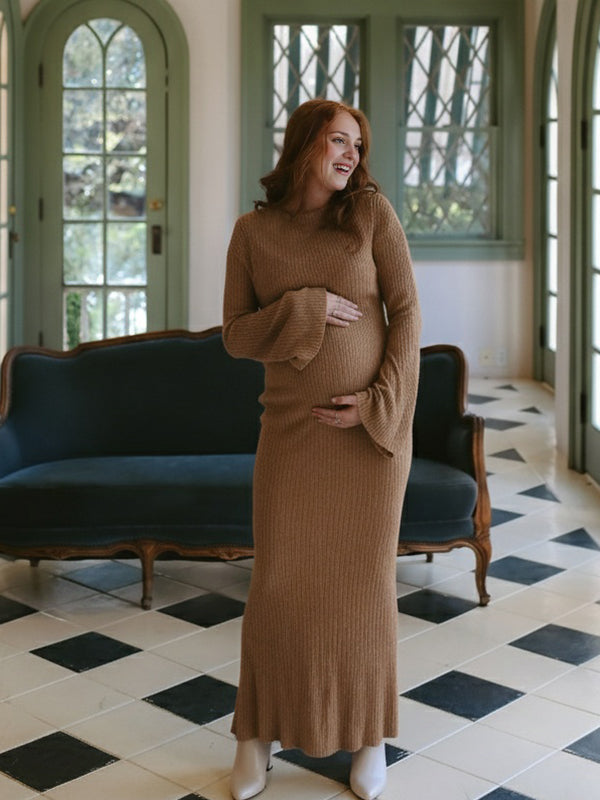 Momyknows Coffee Tuxtured Round Neck Flare Sleeve Bodycon Maternity Maxi Dress