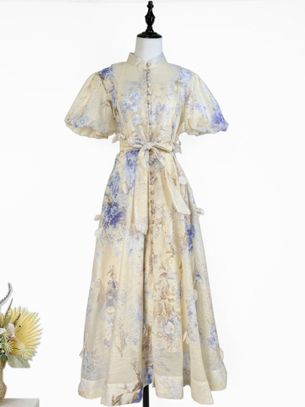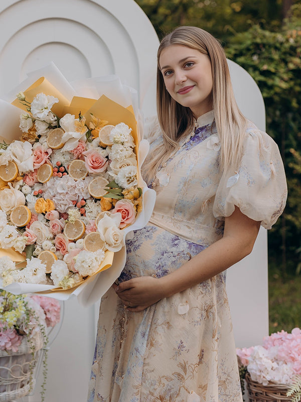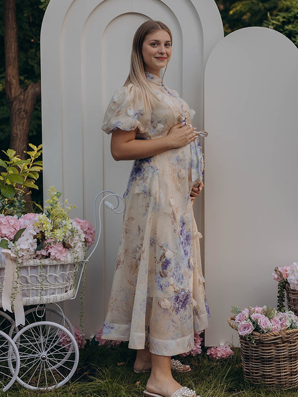 Momyknows Floral Single Breasted Ruffle Belt A-line Princess Maternity Maxi Dress