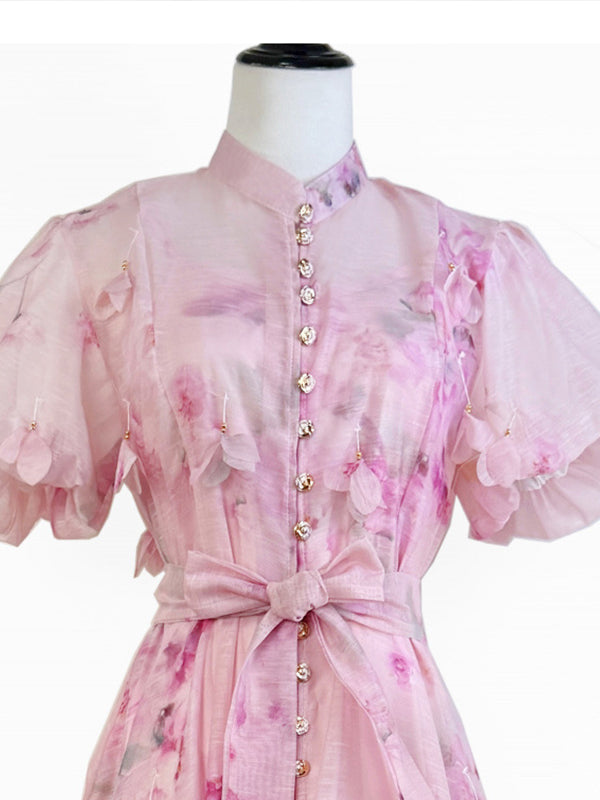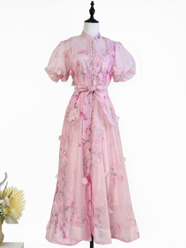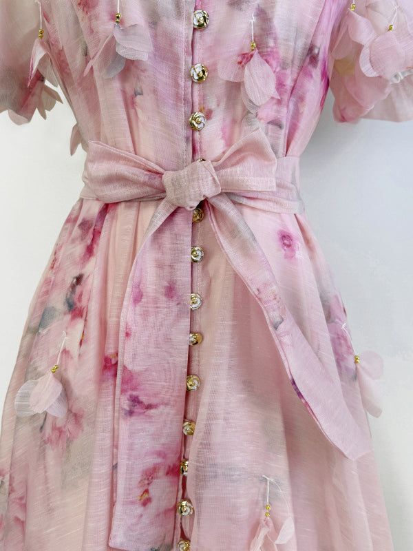 Decoration: Ruffle, falbala, single breasted, buttons, belt, a-line, big swing, 3d flowers