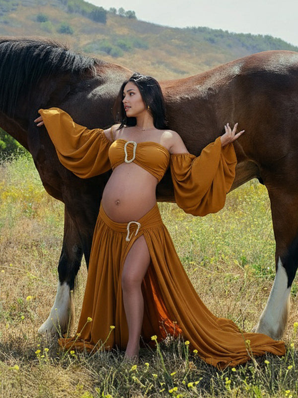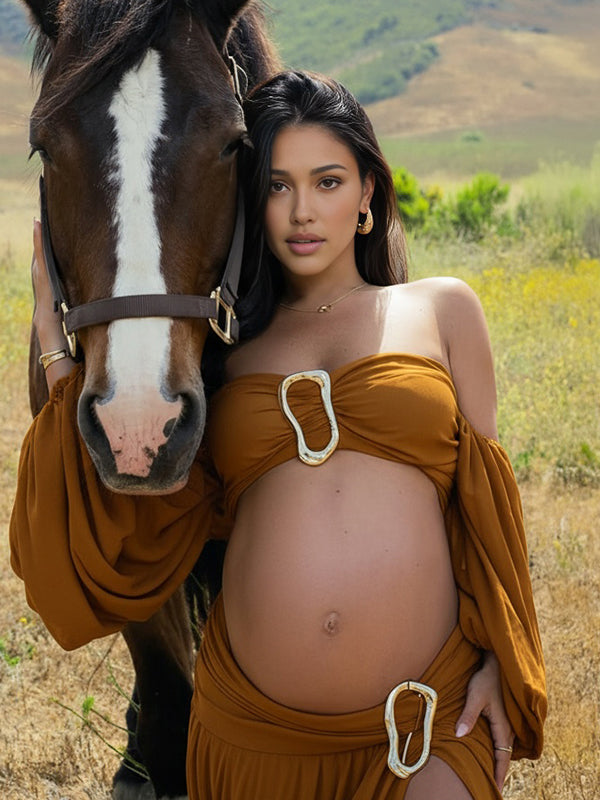 Momyknows Flowy Off Shoulder Ruched Metal Buckle Side Slit Two Piece Set Maternity Maxi Dress