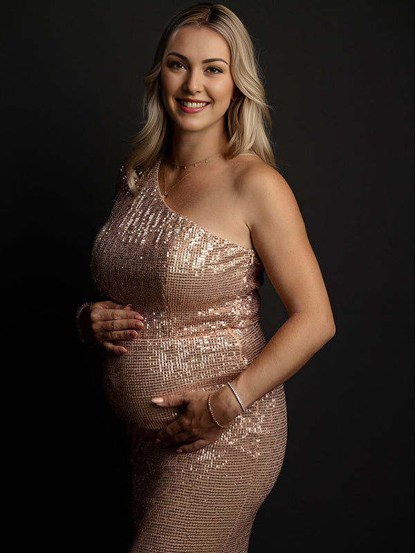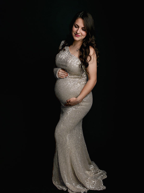 Momyknows Glitter Sequin One Shoulder Mermaid Elegant Christmas Evening Gown Maternity Photoshoot Maxi Dress