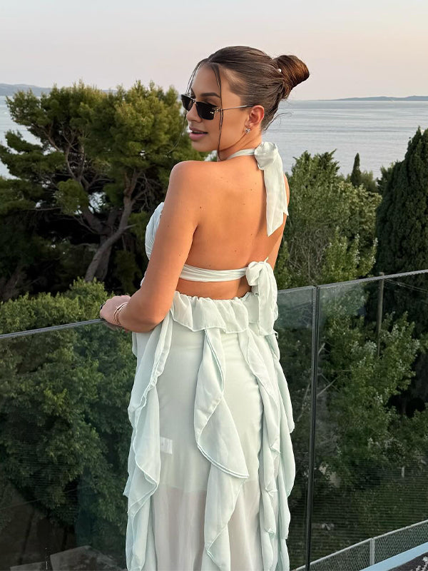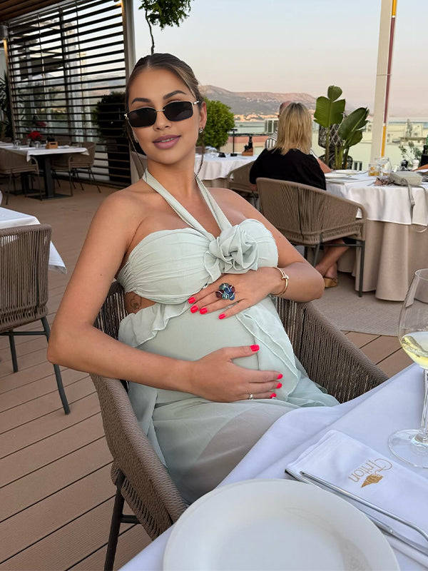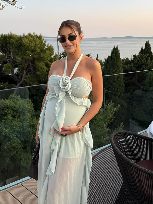 Momyknows Green 3D Flowers Ruffle Cut Out Slit Baby Shower Maternity Maxi Dress