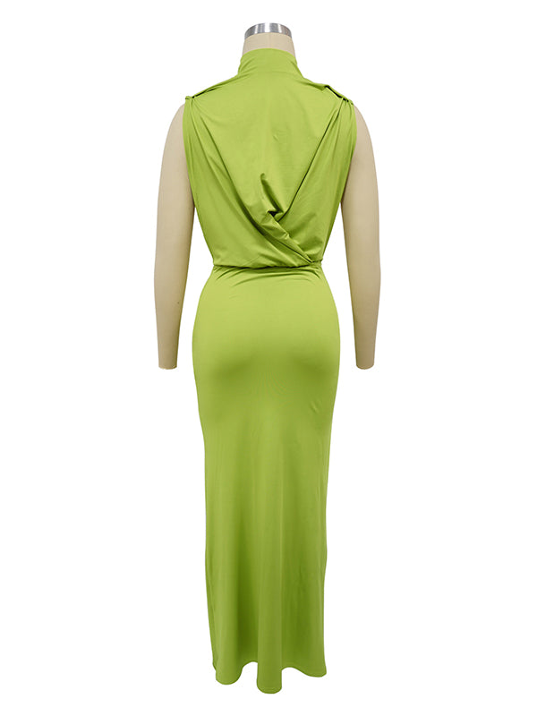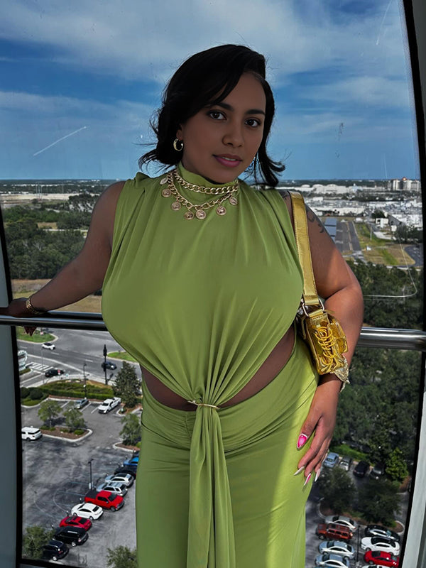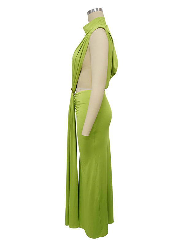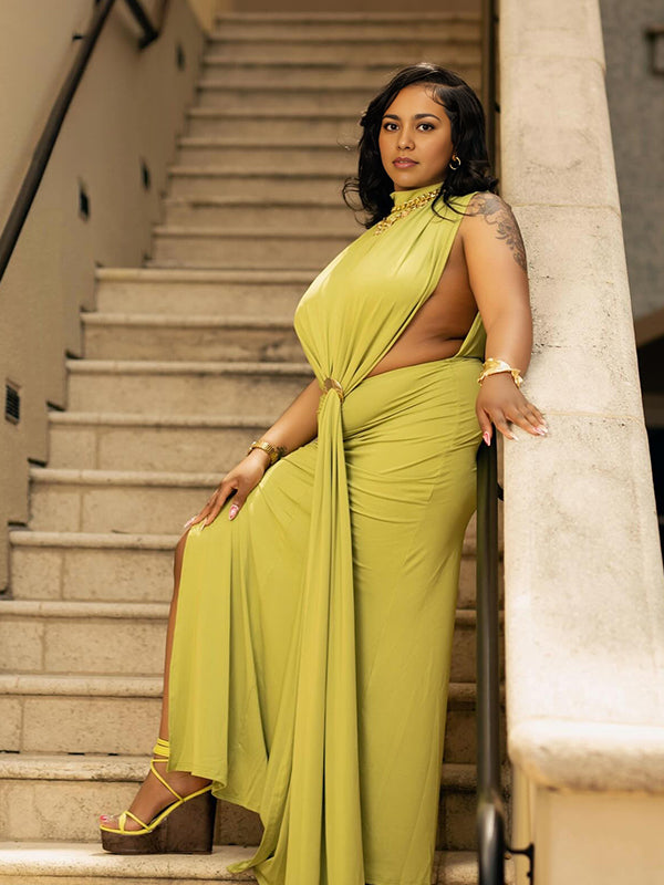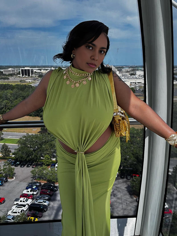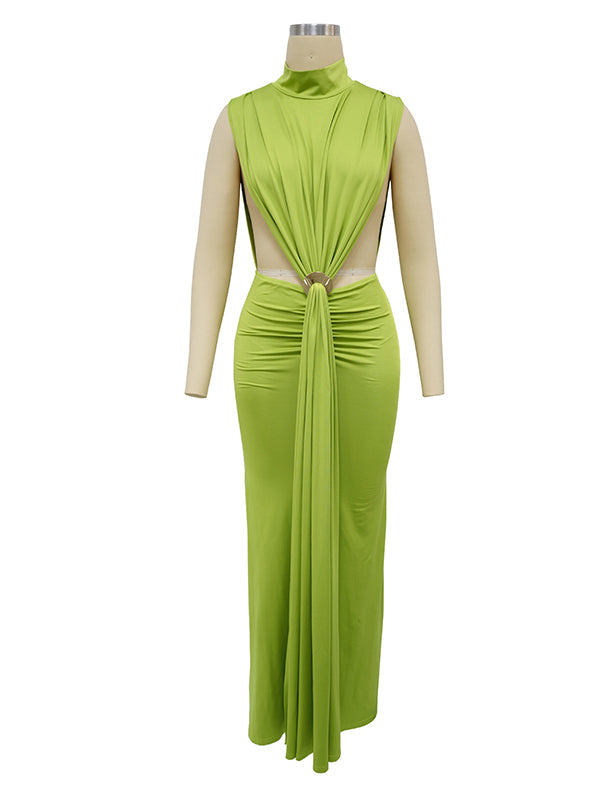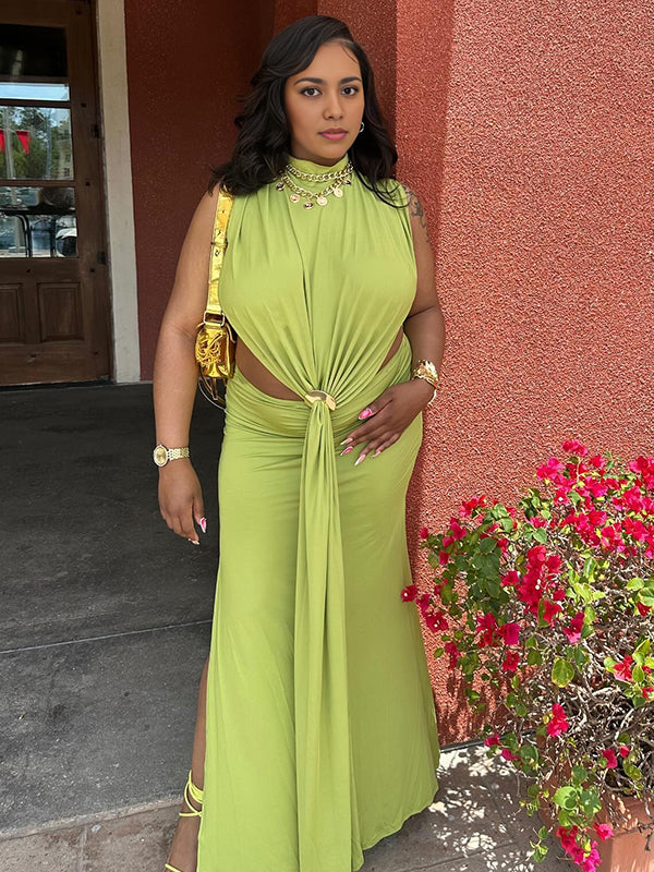 Momyknows Green Ruched Cut Out Metal Buckle Draped Side Slit Maternity Maxi Dress