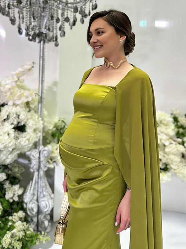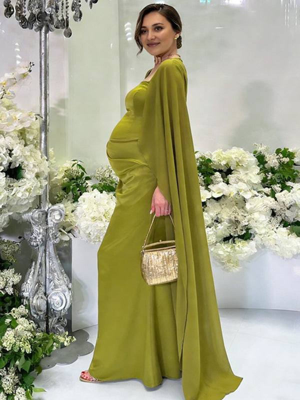 Momyknows Green Spliced Cape Backless Ruched Maternity Photoshoot Maxi Dress