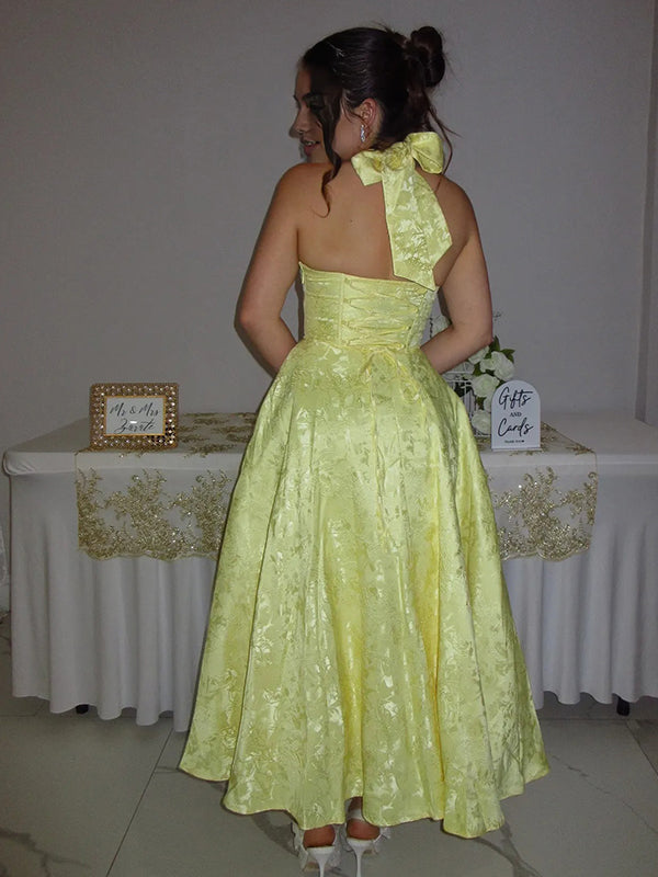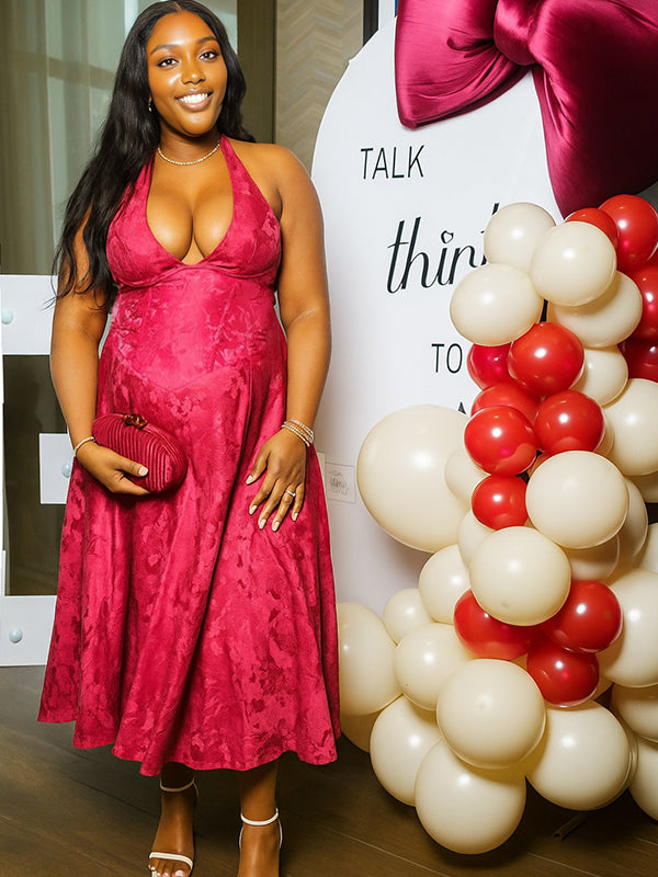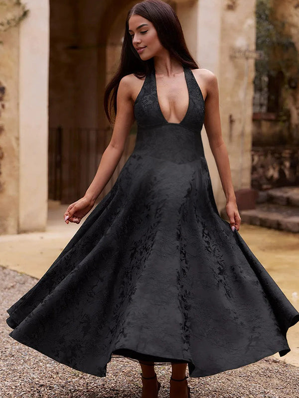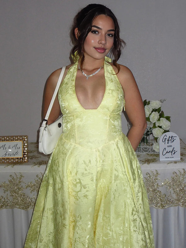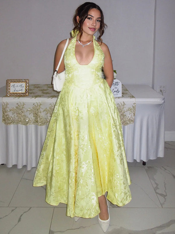 Momyknows Jecquard Bodice Lace-up Tie Back A-line Plunge Halter Neck Princess Maternity Maxi Dress