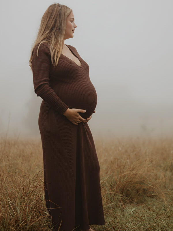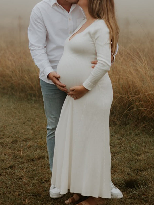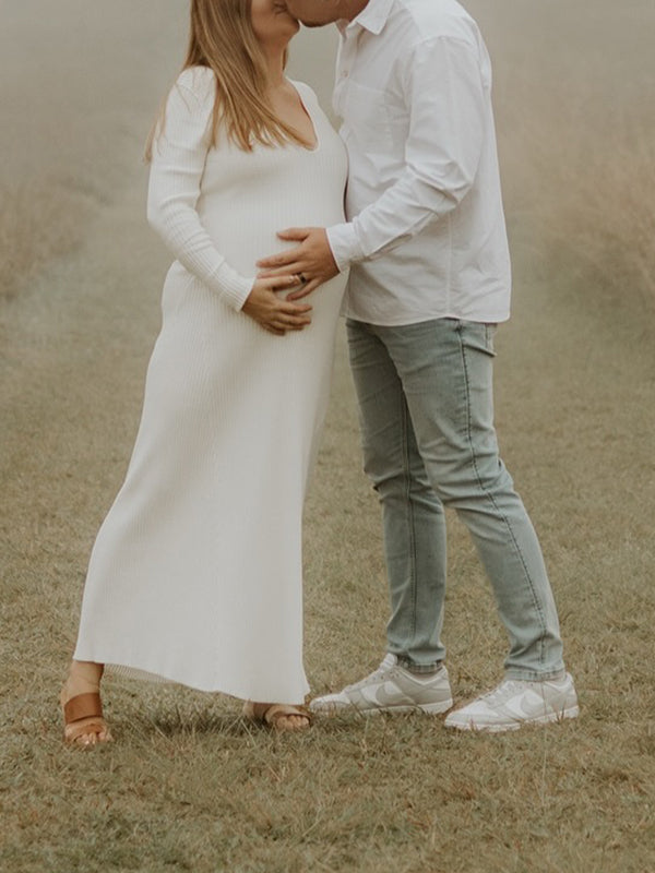 Momyknows Knit V-neck Long Sleeve Bodycon Basic Maternity Maxi Dress