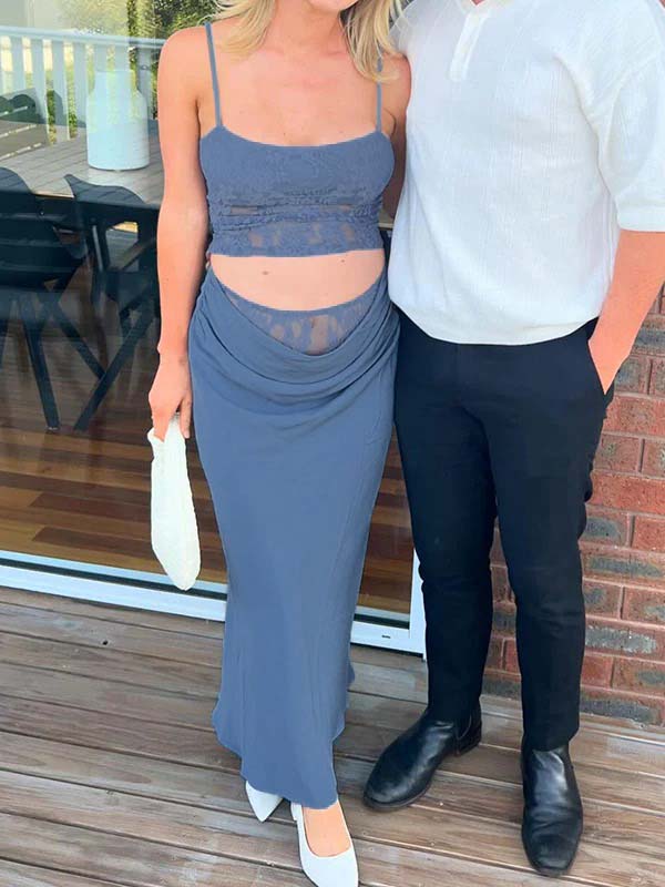Momyknows Lace Patchwork Ruched Two Piece Set Cami Crop Top And Maxi Bodycon Skirt Elegant Maternity Photoshoot Maxi Dress