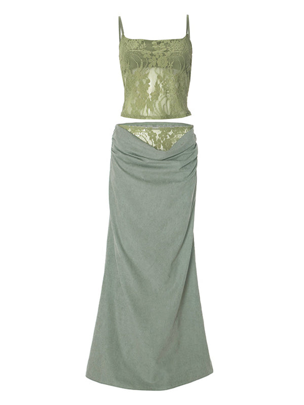 Decoration: Lace, patchwork, ruched, two piece set, cami, crop, spaghetti strap