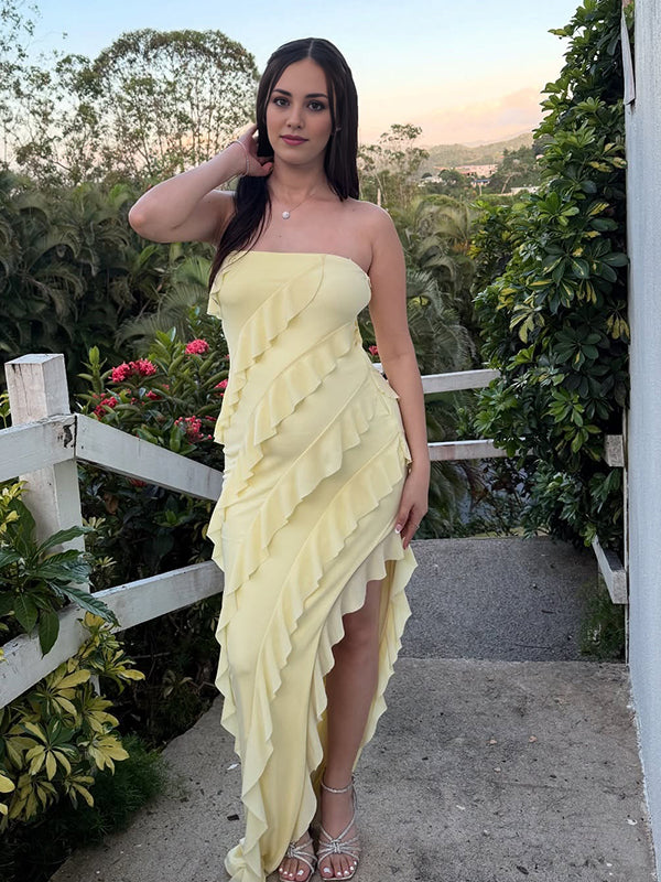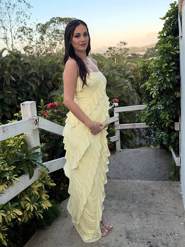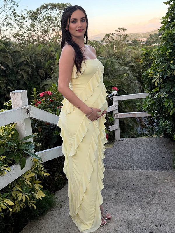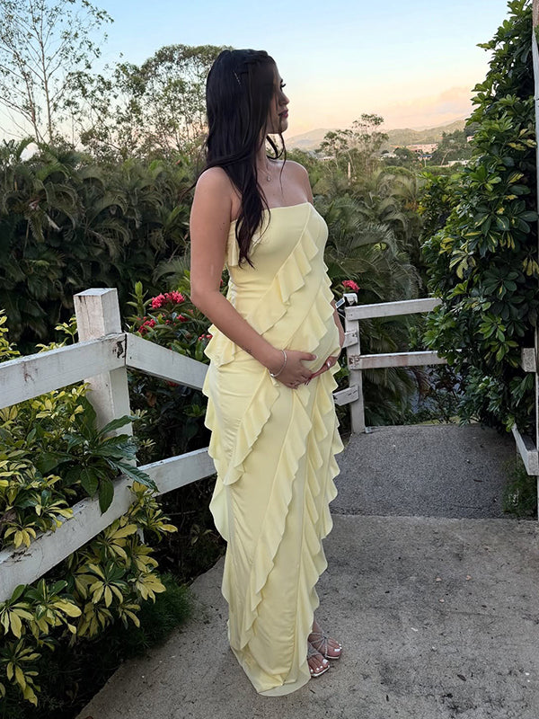 Momyknows Light Yellow Ruffle Side Slit Maternity Photoshoot Maxi Dress