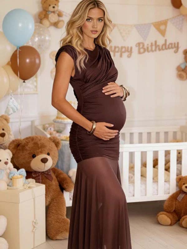 Momyknows Mesh Ruched Bodice Drop Shoulder Flared Hem Maternity Maxi Dress