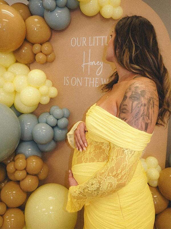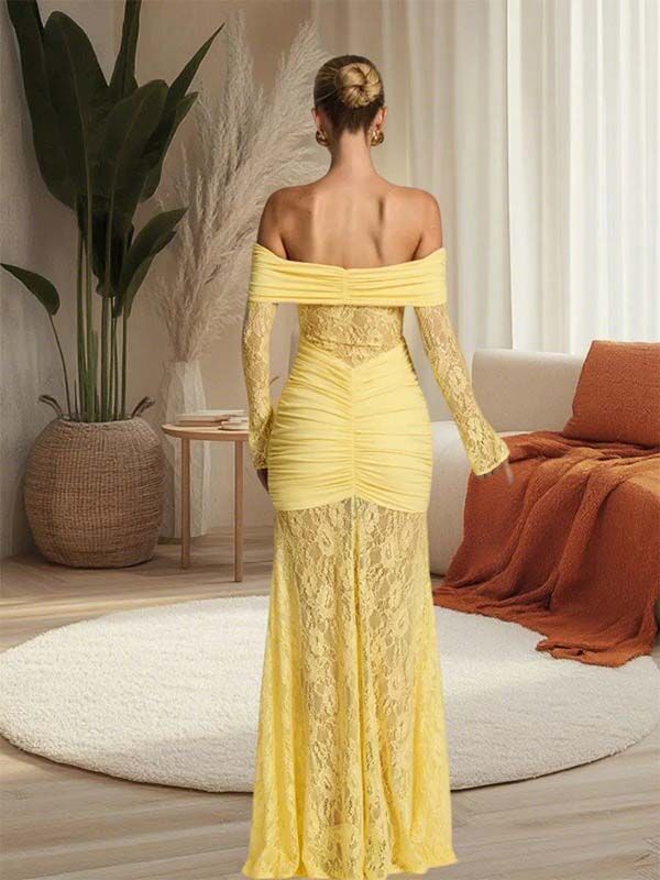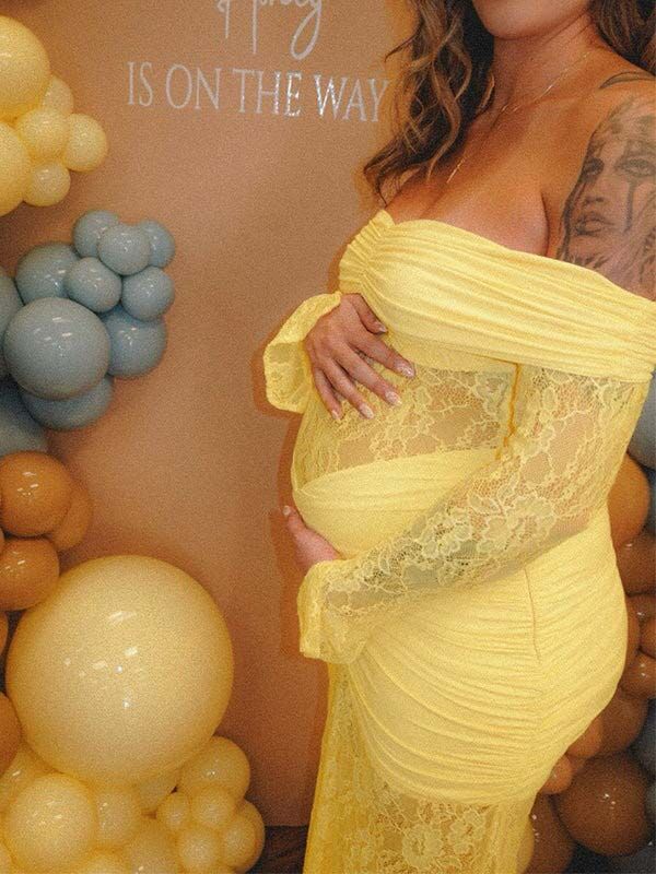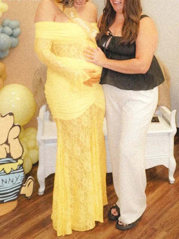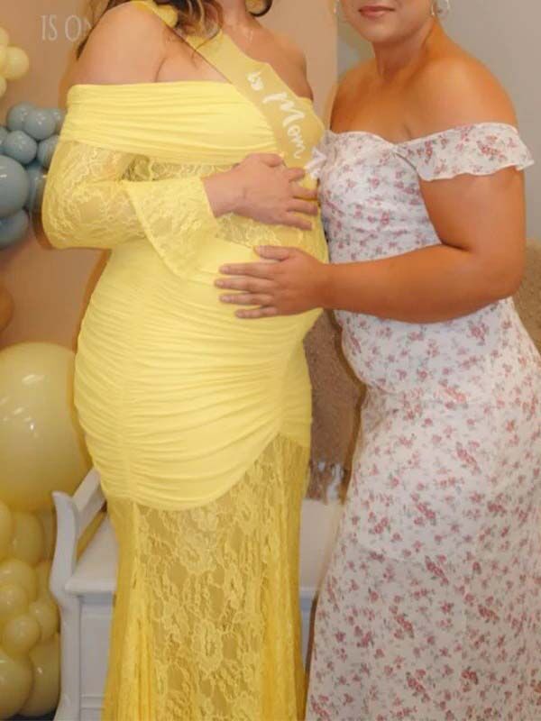 Momyknows Off Shoulder Lace Ruched Mermaid Baby Shower Maternity Maxi Dress