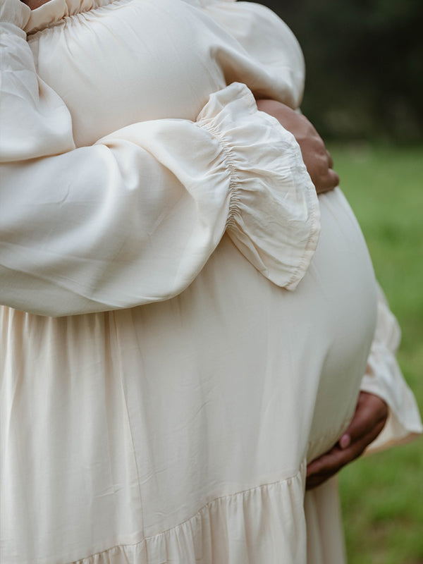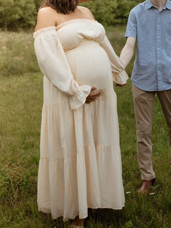 Momyknows Off Shoulder Ruffle Side Slit Big Swing Boho Maternity Photoshoot Maxi Dress