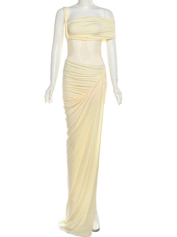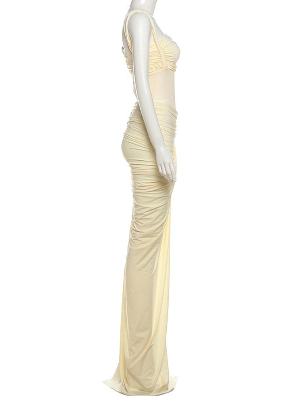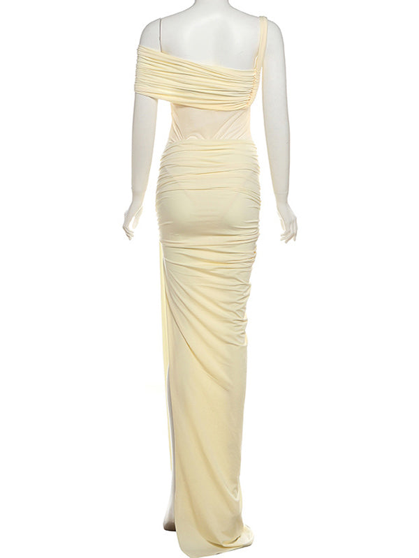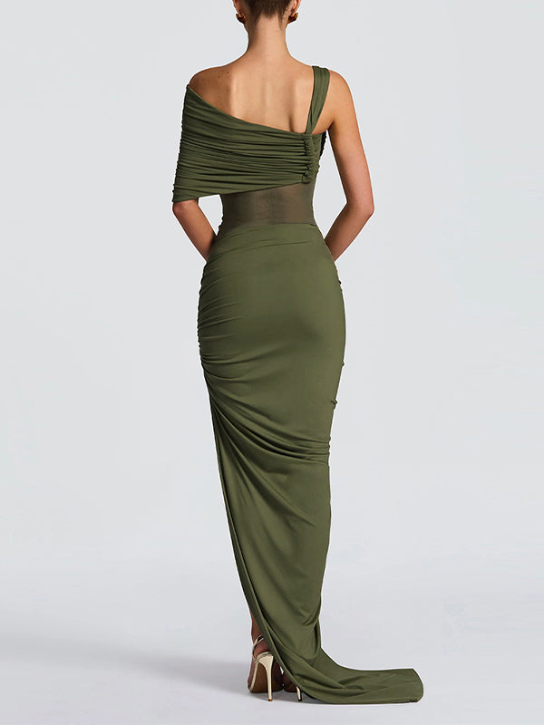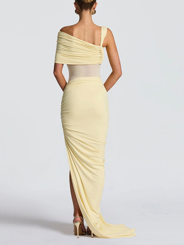 Momyknows One Shoulder Ruched Grenadine Sheer Side Slit Maternity Maxi Dress