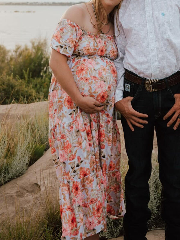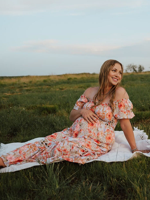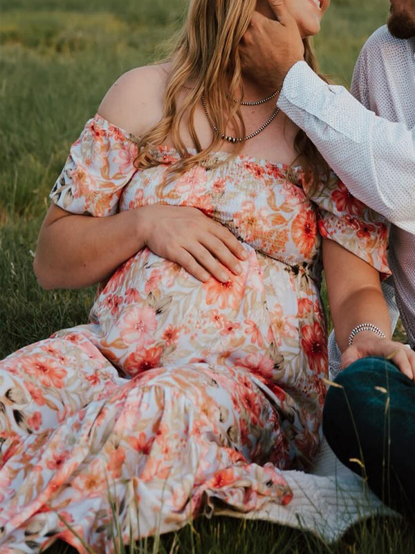 Momyknows Orange Off Shoulder Smoked Scattered Flowers Maternity Photoshoot Maxi Dress