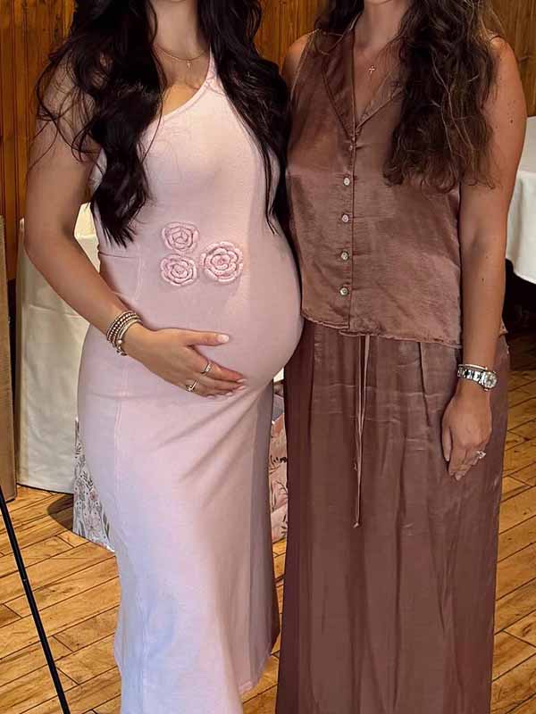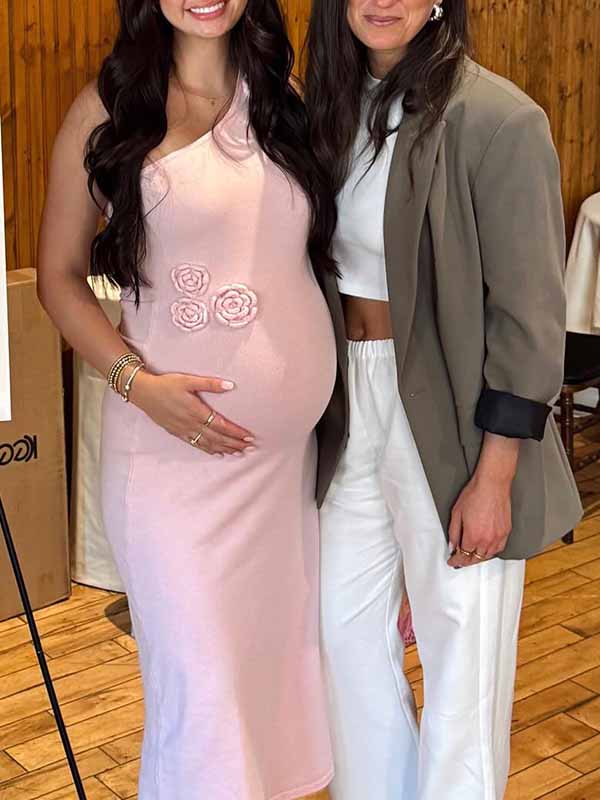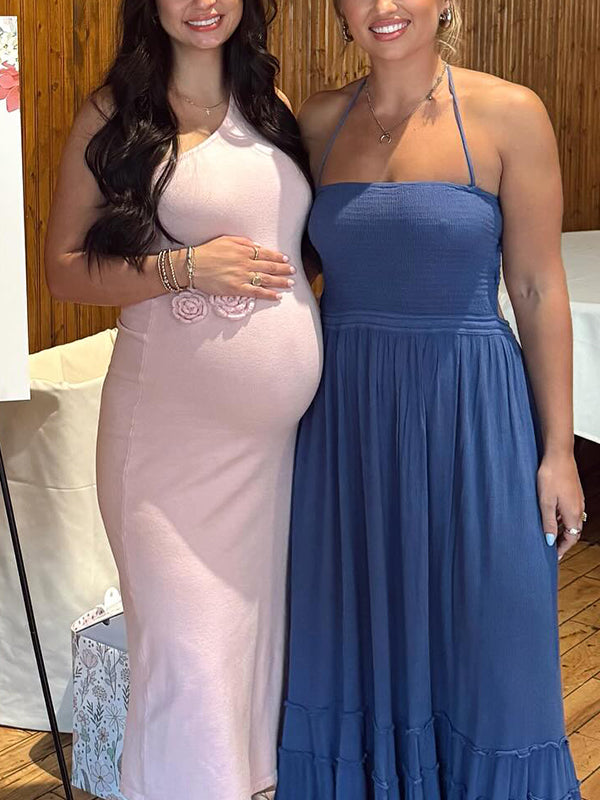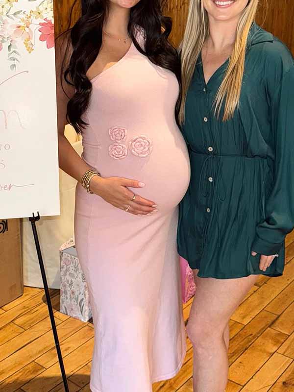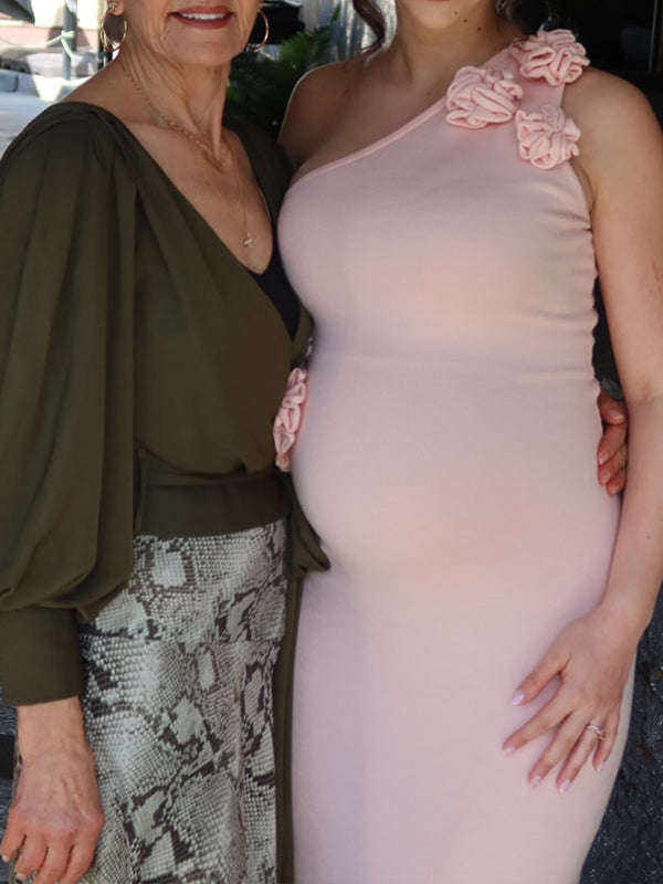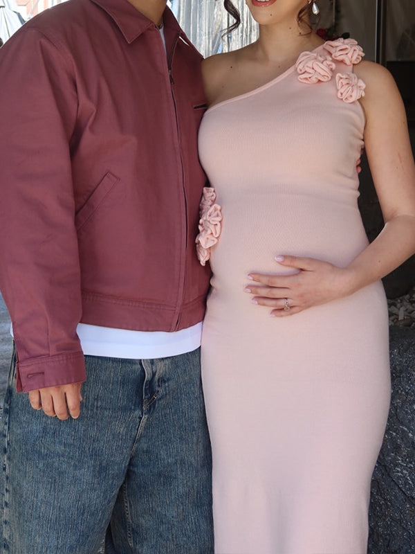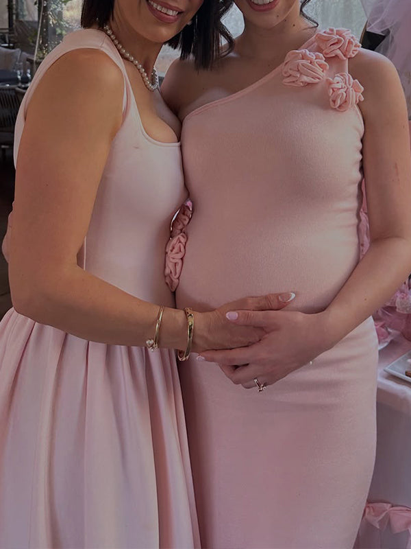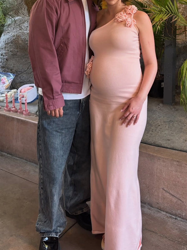 Momyknows Pink Knit 3D Flowers One Shoulder Mermaid Maternity Maxi Dress