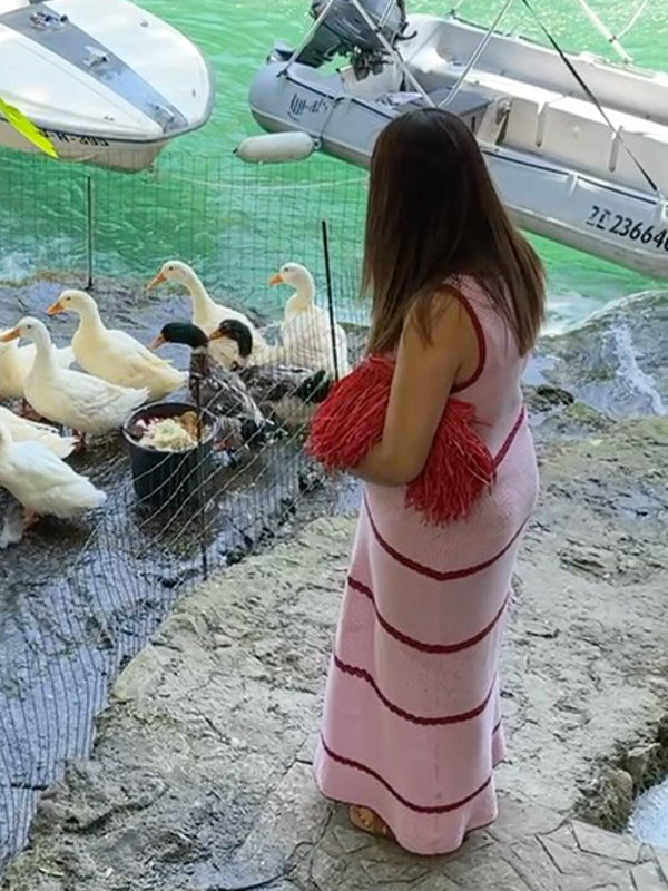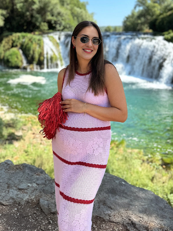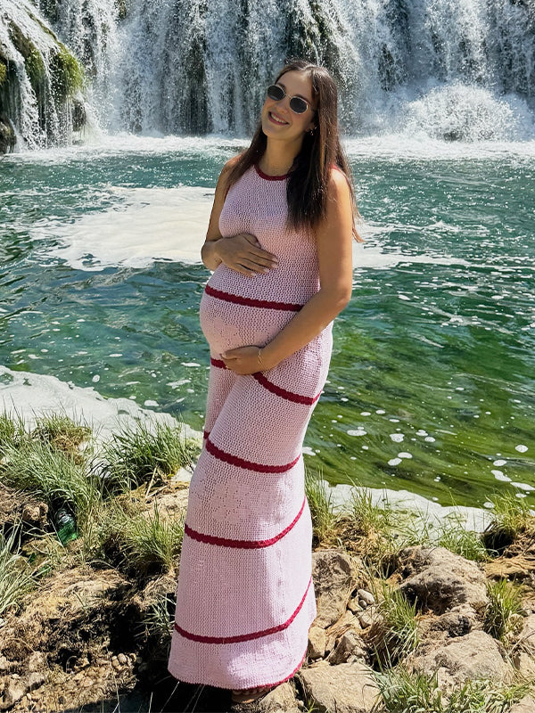 Momyknows Pink Knit Striped Flowers Photoshoot Maternity Maxi Dress
