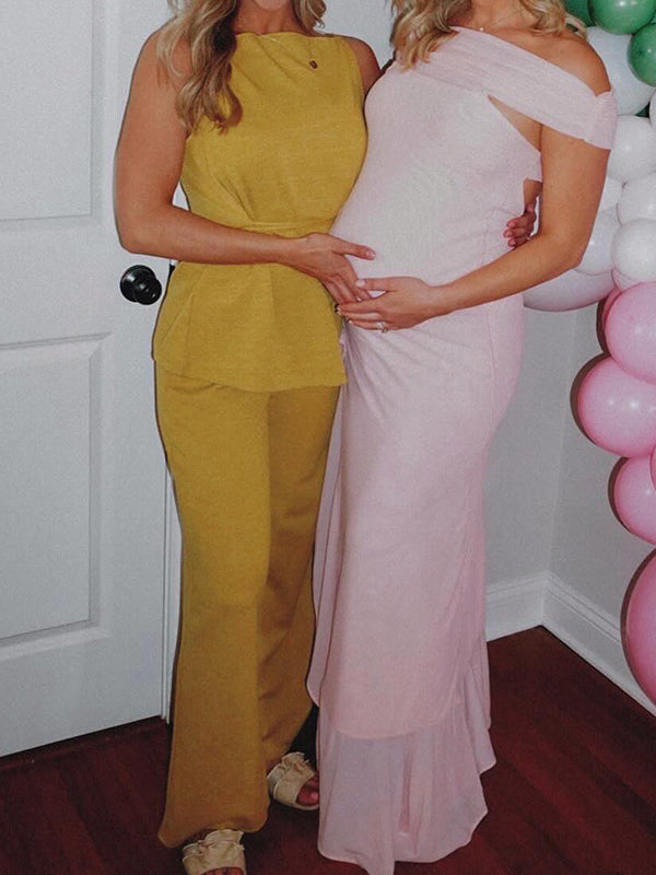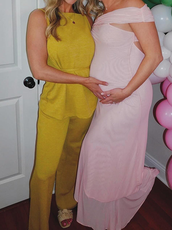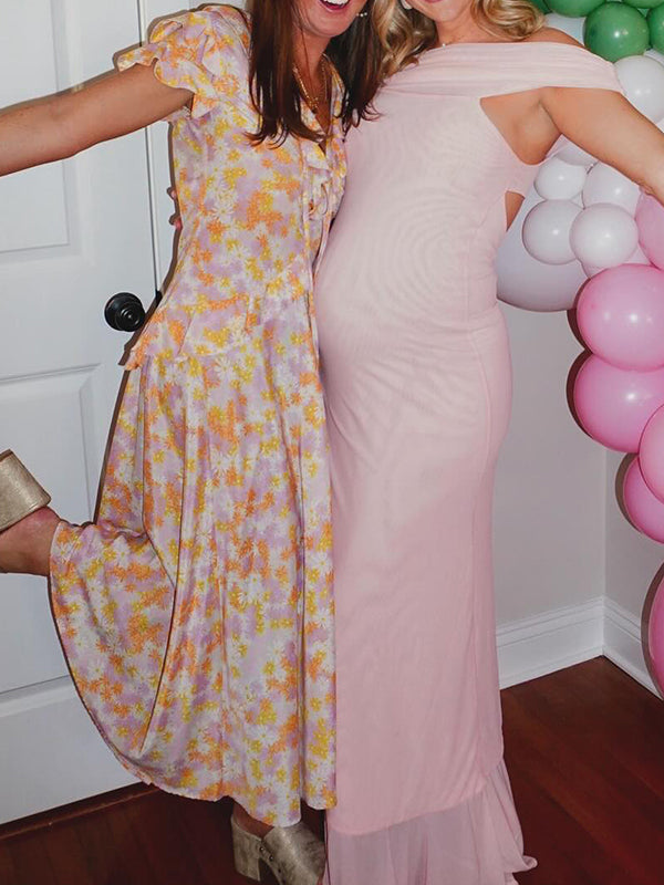 Momyknows Pink Mesh Off Shoulder Ruched Ruffle Side Slit Maternity Maxi Dress