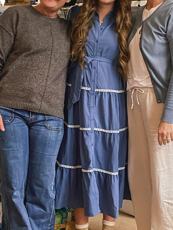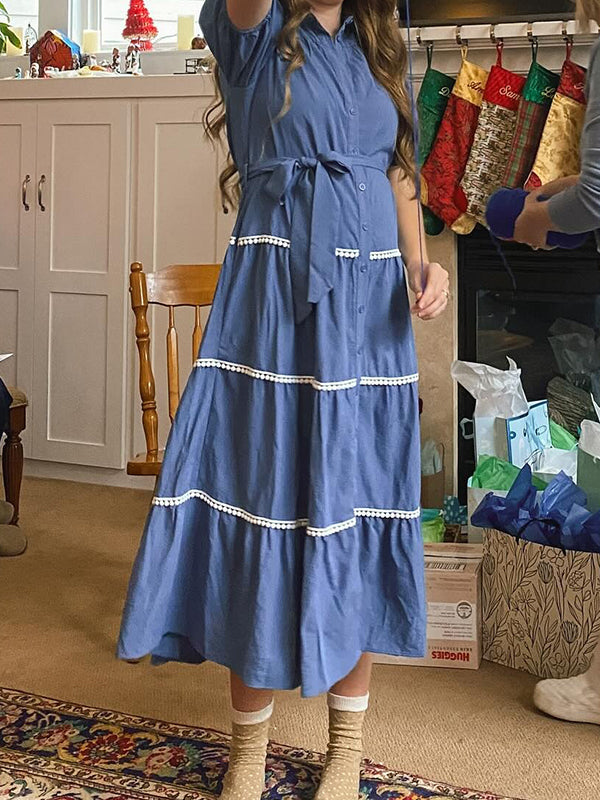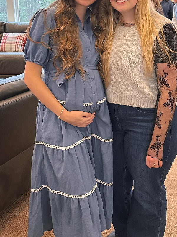 Momyknows Puff Sleeve Lace-up Button Maternity Baby Shower Maxi Dress