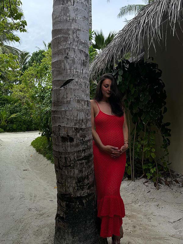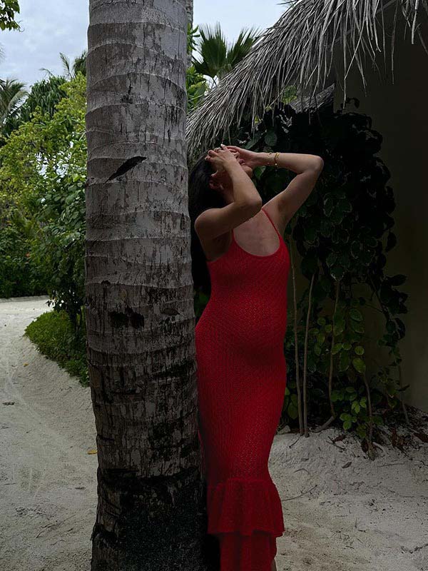 Momyknows Red Crochet Hollow Out Ruffle Falbala Frill Hem Cami Bodycon Elegant Baby Moon Beach Maternity Photoshoot Baby Shower Mini Dress