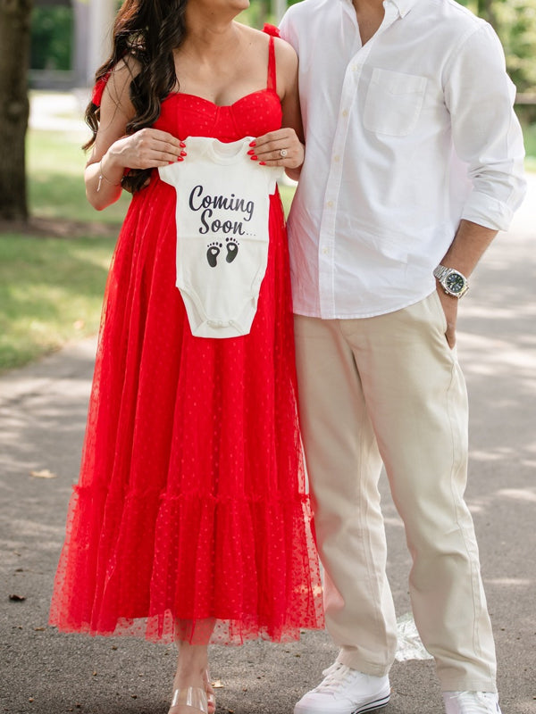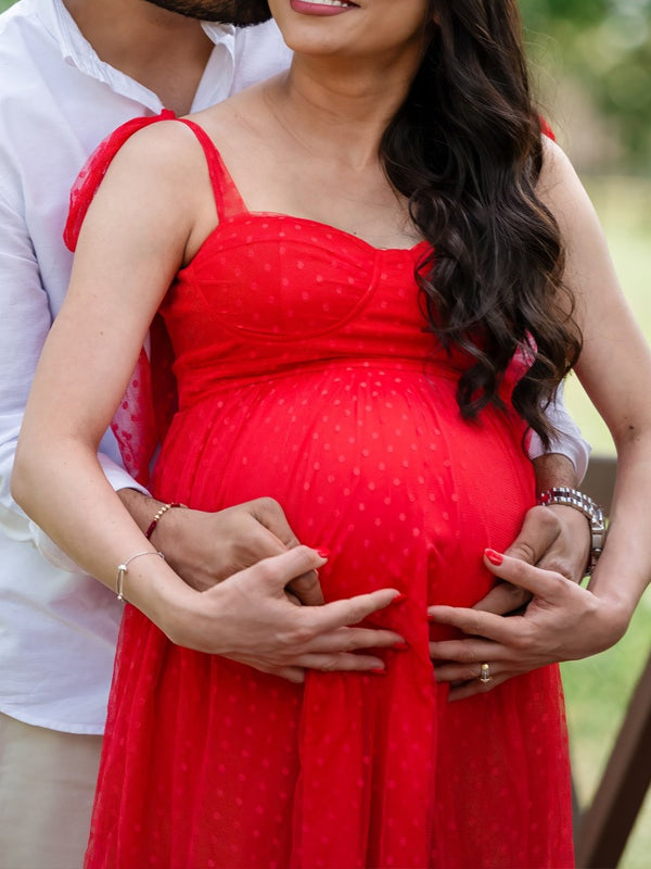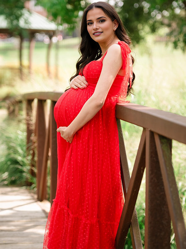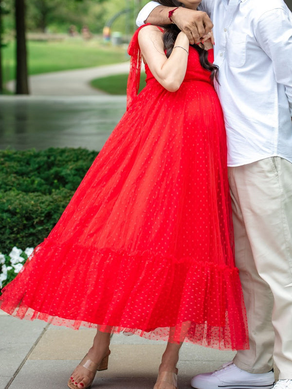 Momyknows Red Glitter Spaghetti Strap lace-up Maternity Photoshoot Maxi Dress