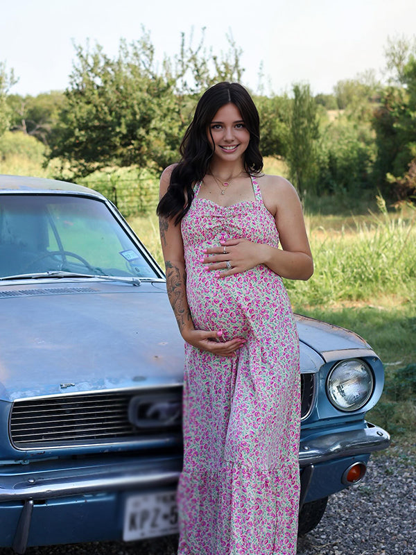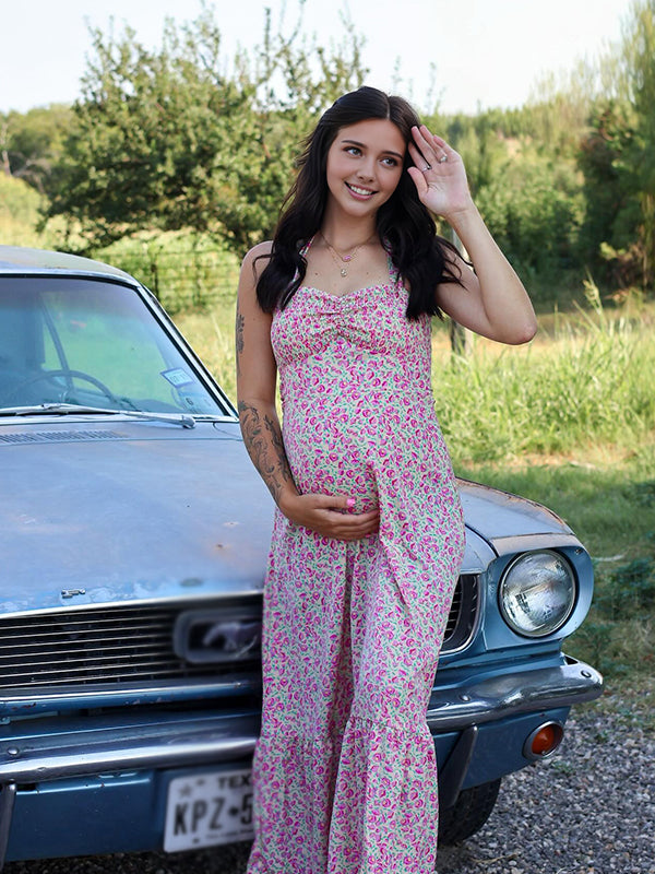 Momyknows Red Halter Neck Stamp Duty Maternity Photoshoot Maxi Dress