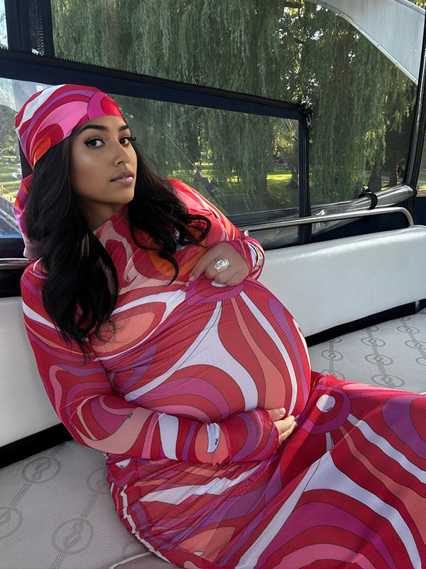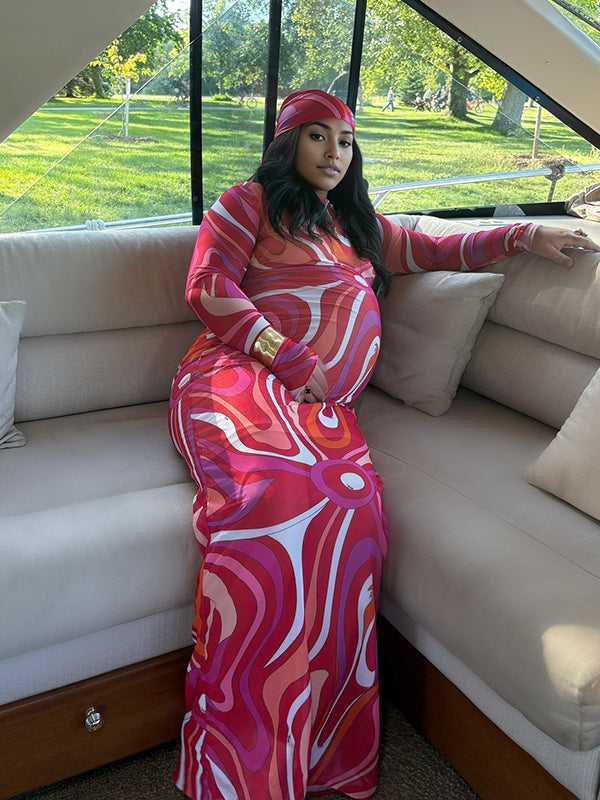 Momyknows Red Round Neck Print Maternity Photoshoot Maxi Dress