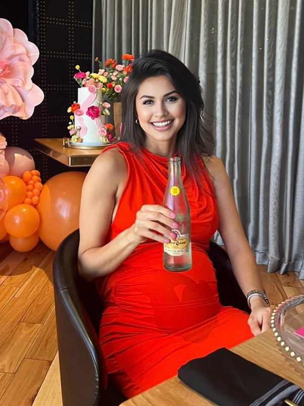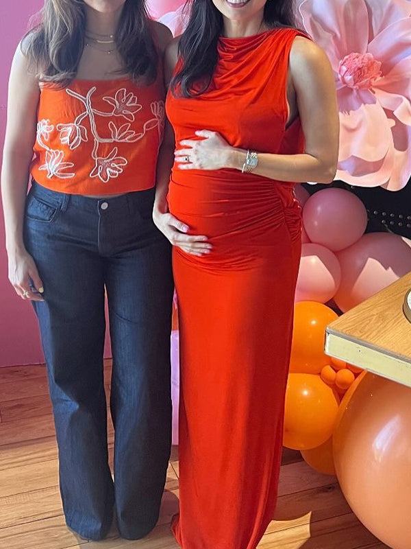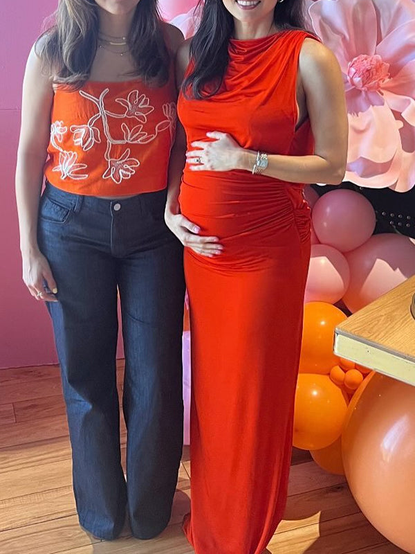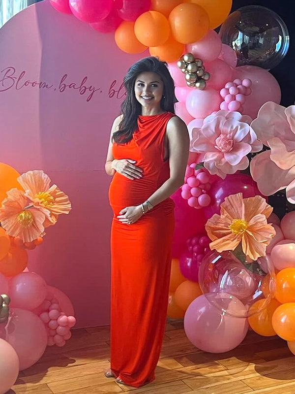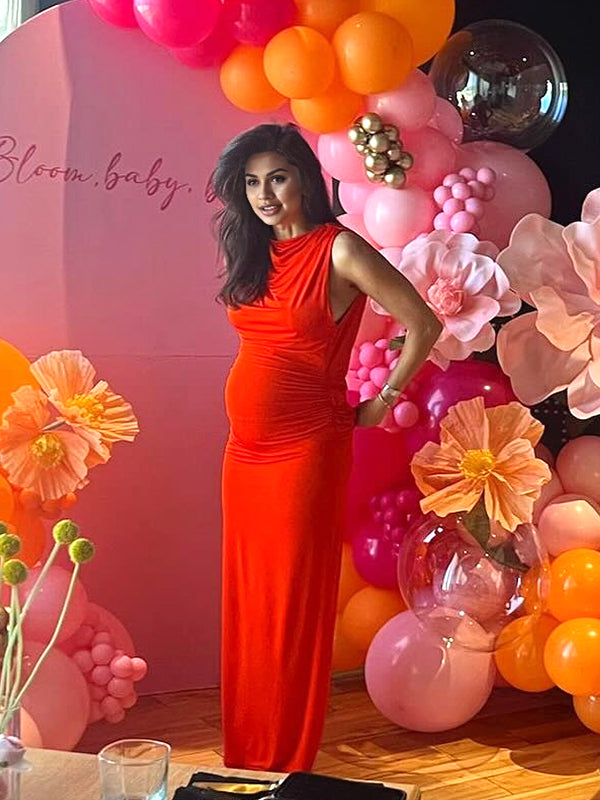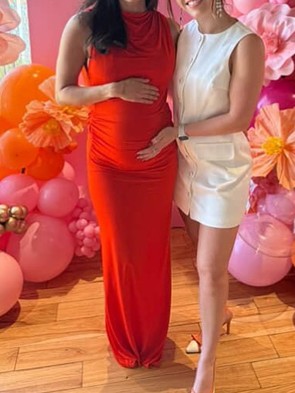 Momyknows Red Ruched Band Collar Maternity Baby Shower Maxi Dress