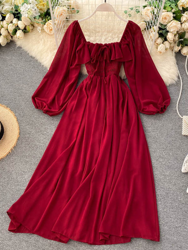 Momyknows Red Ruffle Ruched Lace-up Square Neck A-line Maternity Maxi Dress
