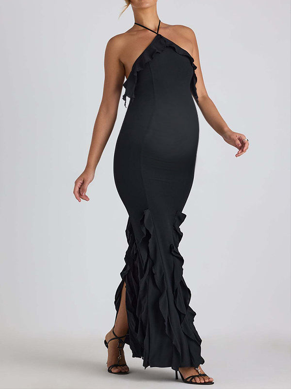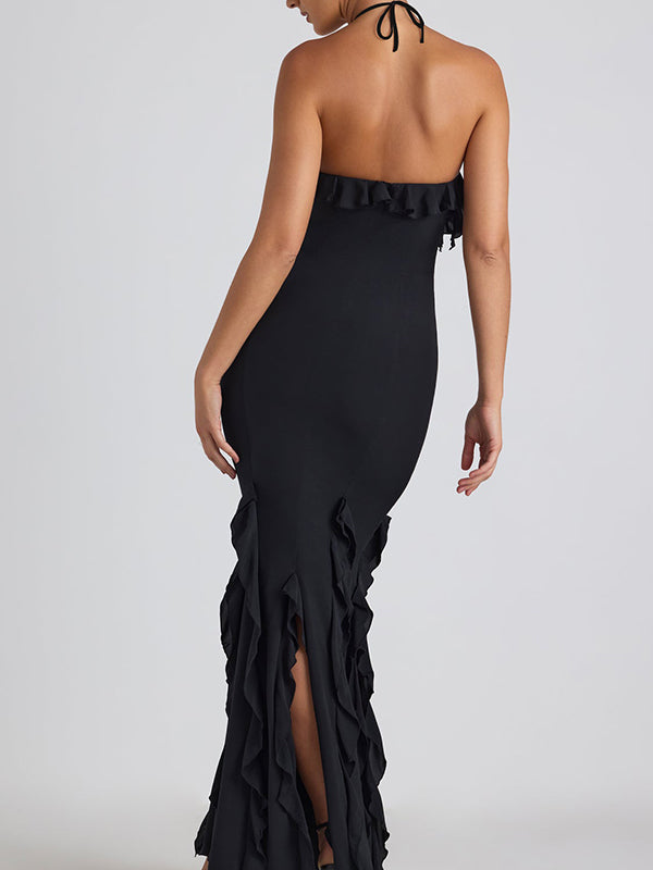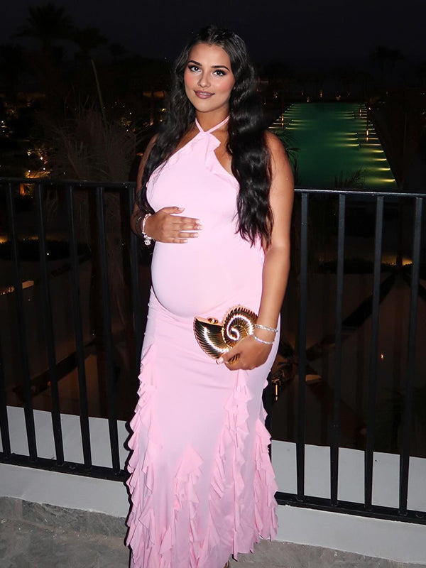 Momyknows Ruffle Cami Backless Back Slit Mermaid Halter Neck Maternity Maxi Dress