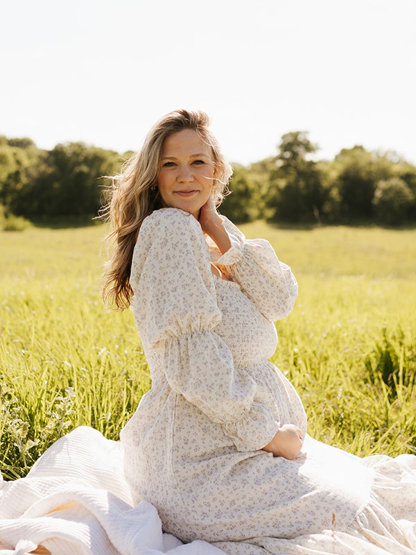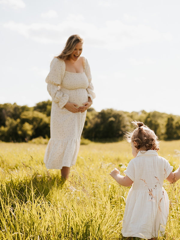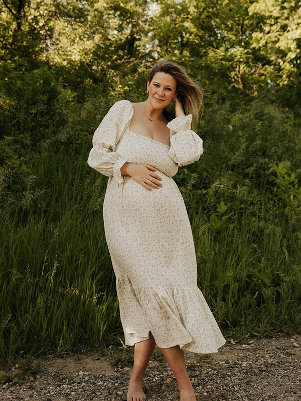 Momyknows Ruffle Ruched High Waist Puff Sleeve Cute Photoshoot Maternity Maxi Dress