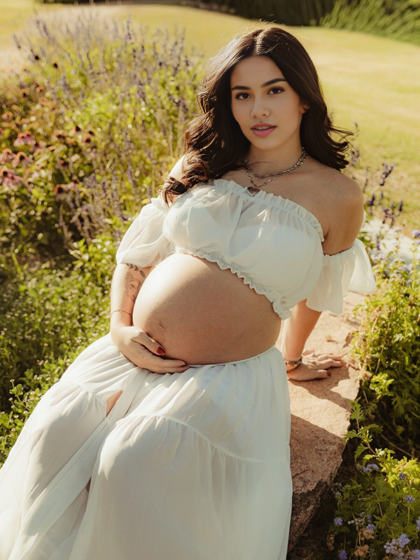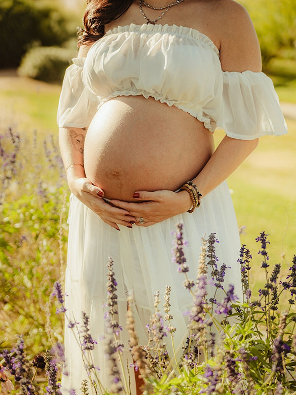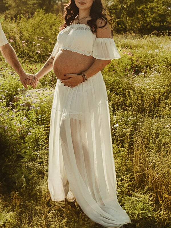 Momyknows Solid Color Bohemian Off Shoulder Backless Ruffle 2 piece set Photoshoot Maternity Maxi Dress