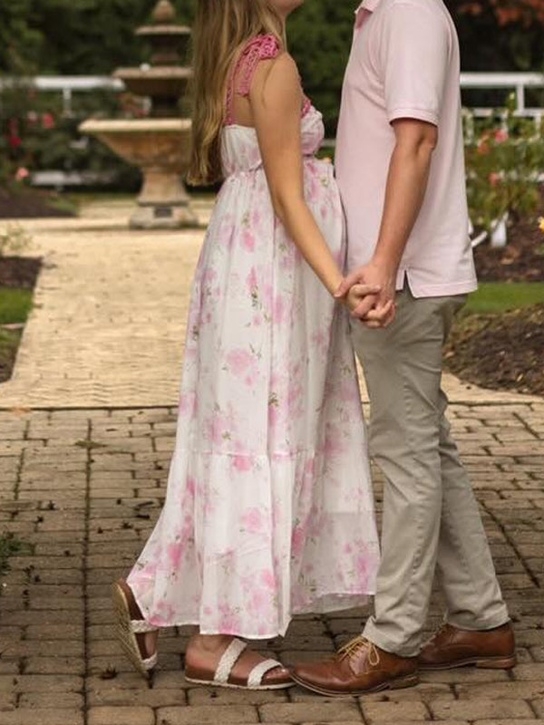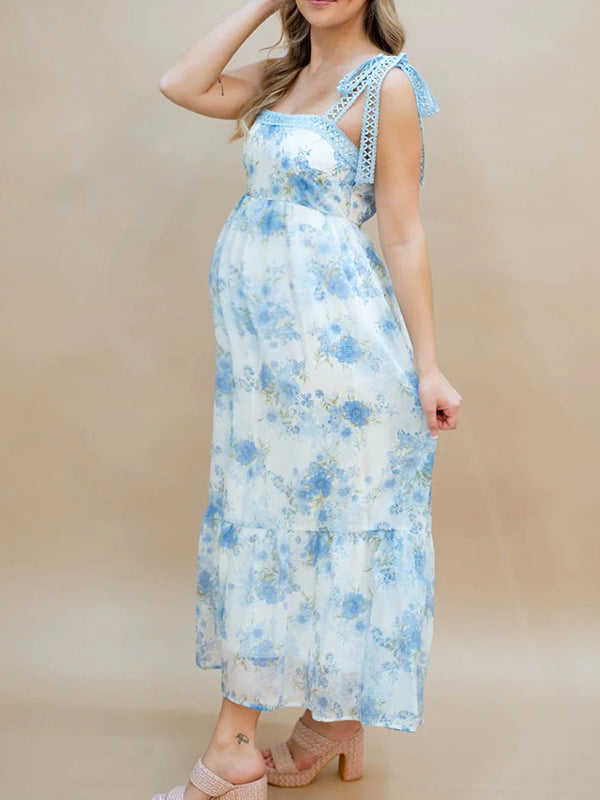 Momyknows Spaghetti Strap Stamp Duty Lace-up Maternity Photoshoot Maxi Dress