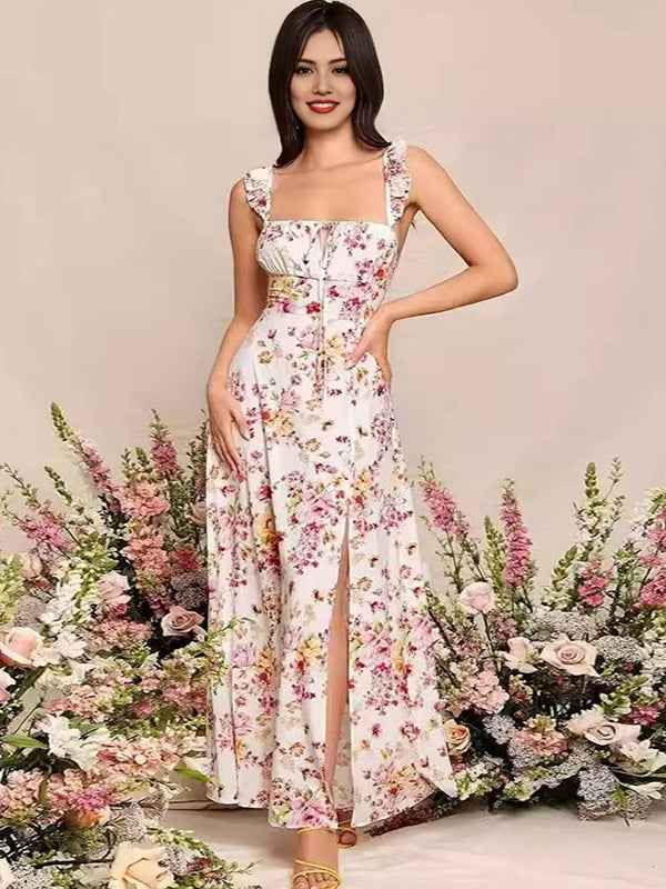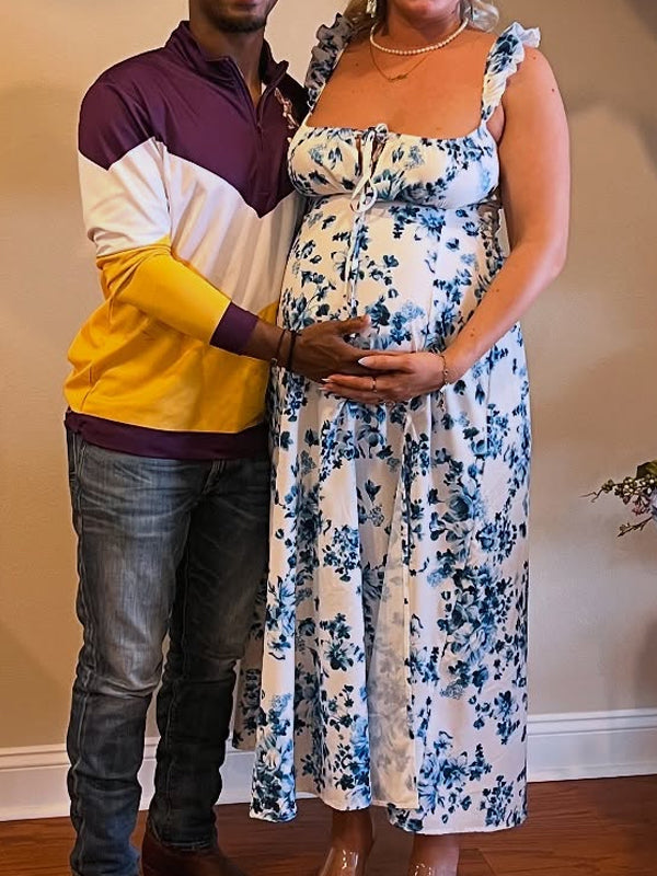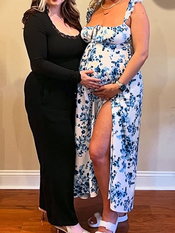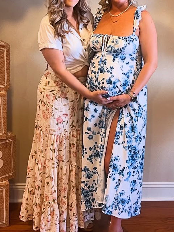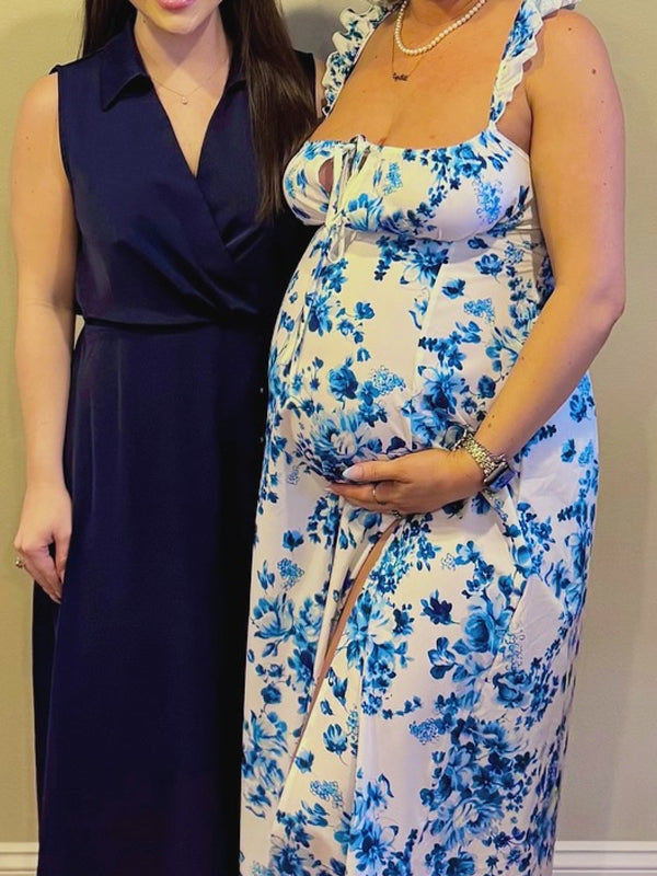 Momyknows Spaghetti Strap Stamp Duty Side Slit Maternity Baby Shower Maxi Dress