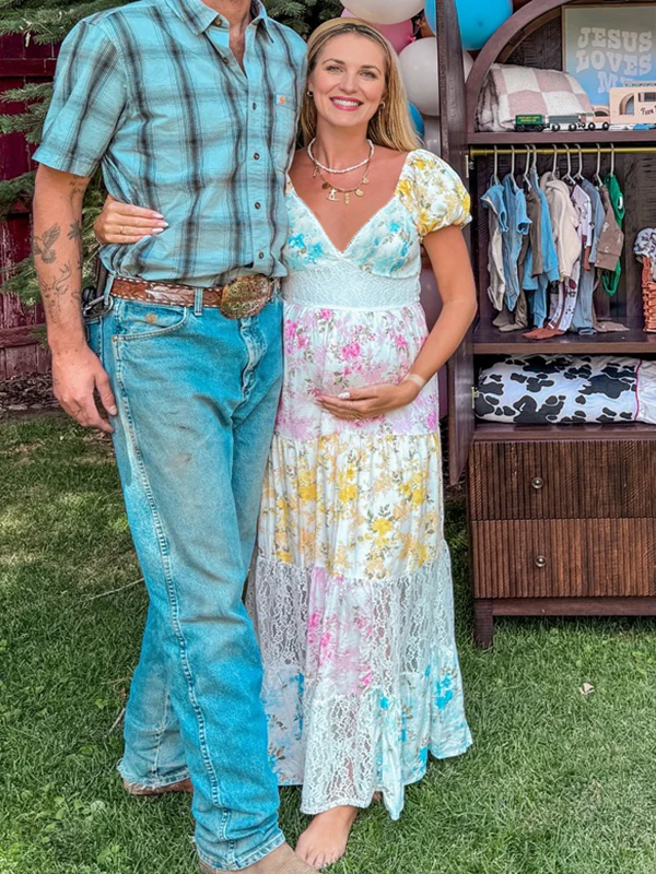 Momyknows Stamp Duty Lace Flower Maternity Baby Shower Maxi Dress