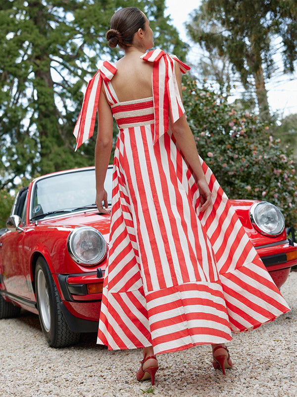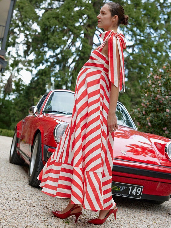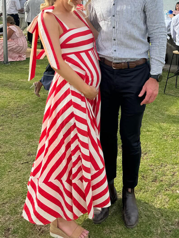 Momyknows Striped Tie Bow Flowy Photoshoot Maternity Maxi Dress