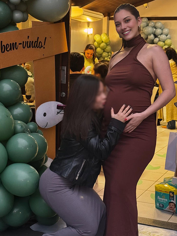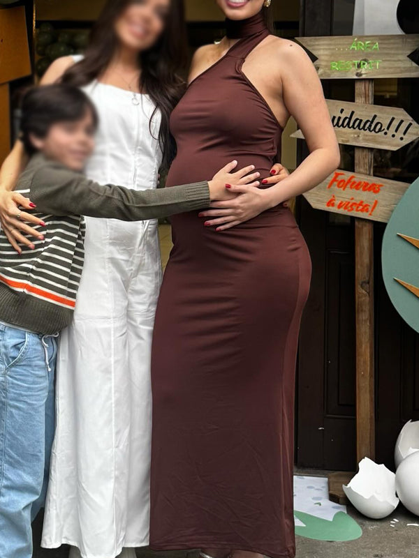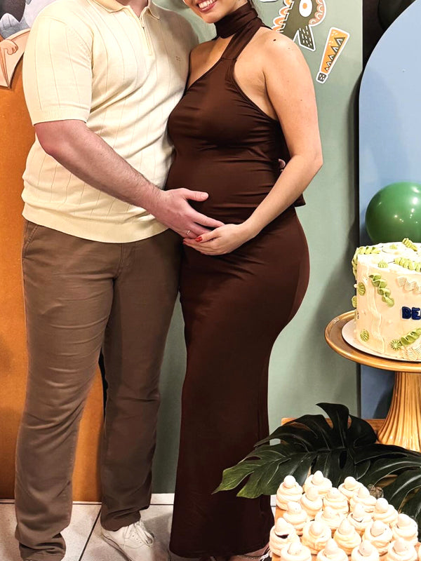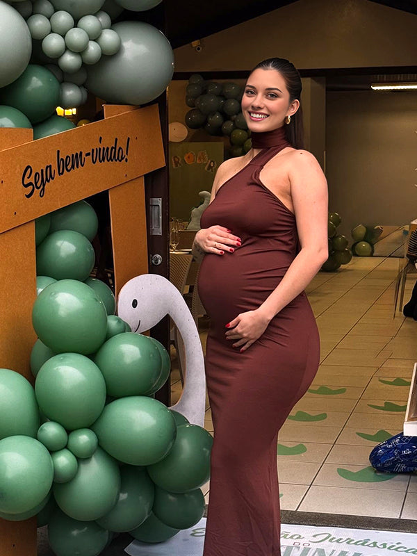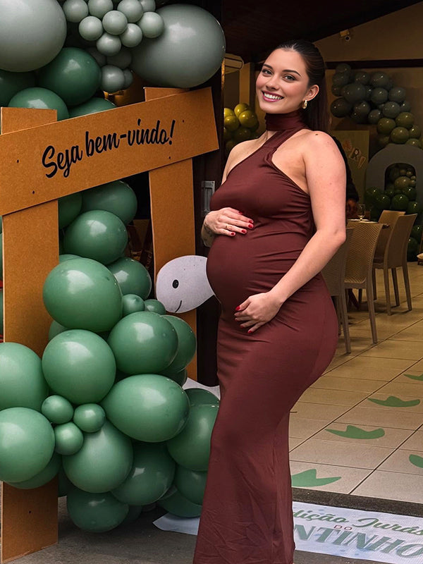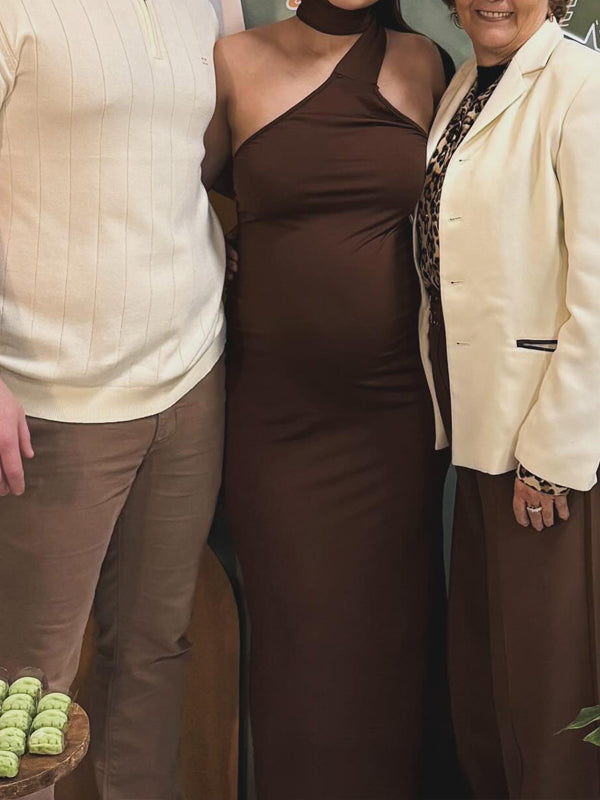 Momyknows Tan Oblique Shoulder Ruched Ribbon Maternity Baby Shower Maxi Dress