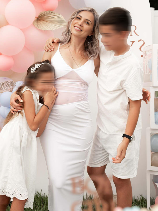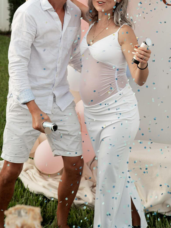 Momyknows White Grenadine Sheer Back Slit Gender Reveal Maternity Maxi Dress