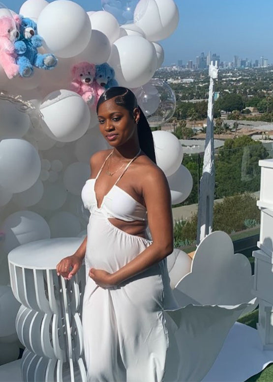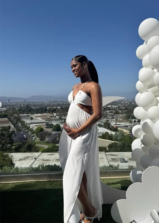Momyknows White Halter Neck Side Slit Babyshower Party Maternity Maxi Dress