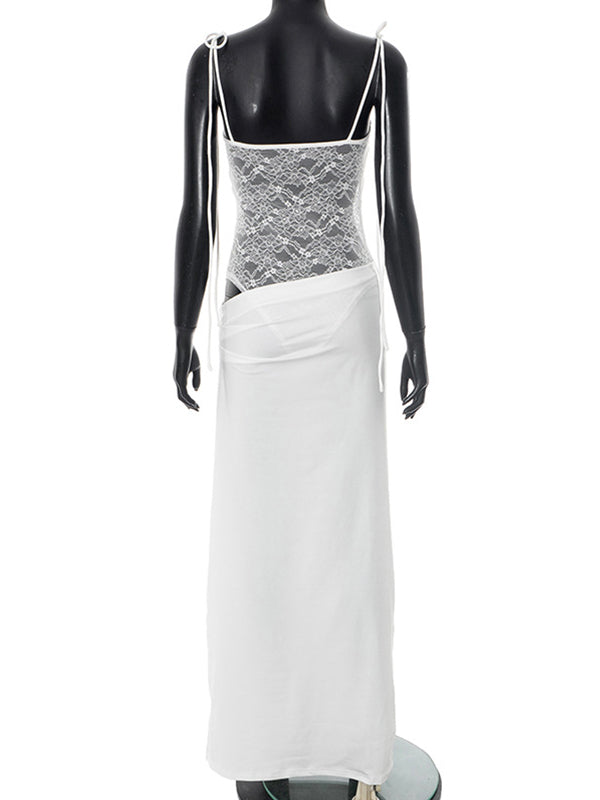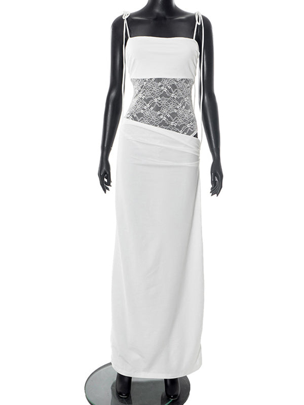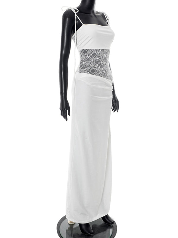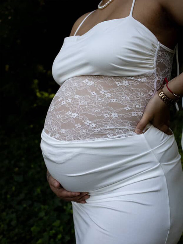 Momyknows White Lace Ruched Patckwork Tie Shoulder Cami Maternity Maxi Dress