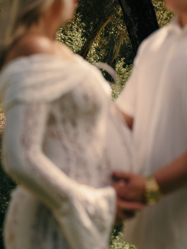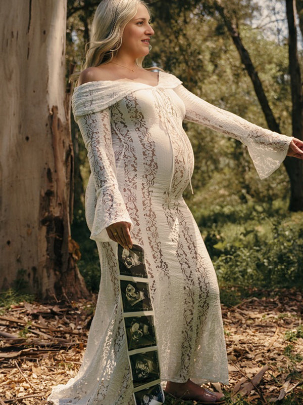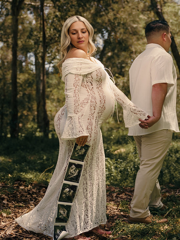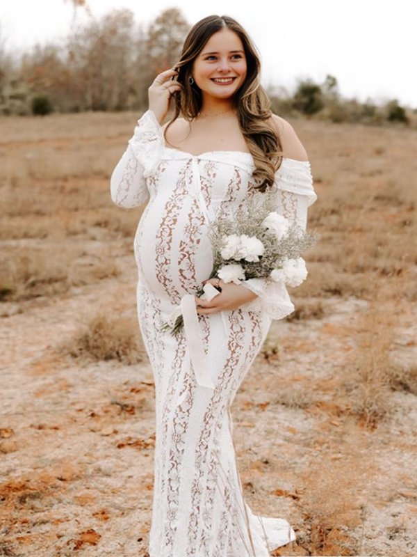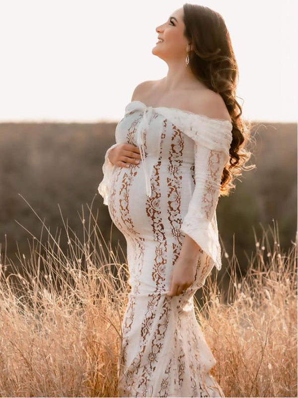 Momyknows White Off Shoulder Lace Bandeau Tie Front Mermaid Plus Size Photoshoot Maternity Maxi Dress
